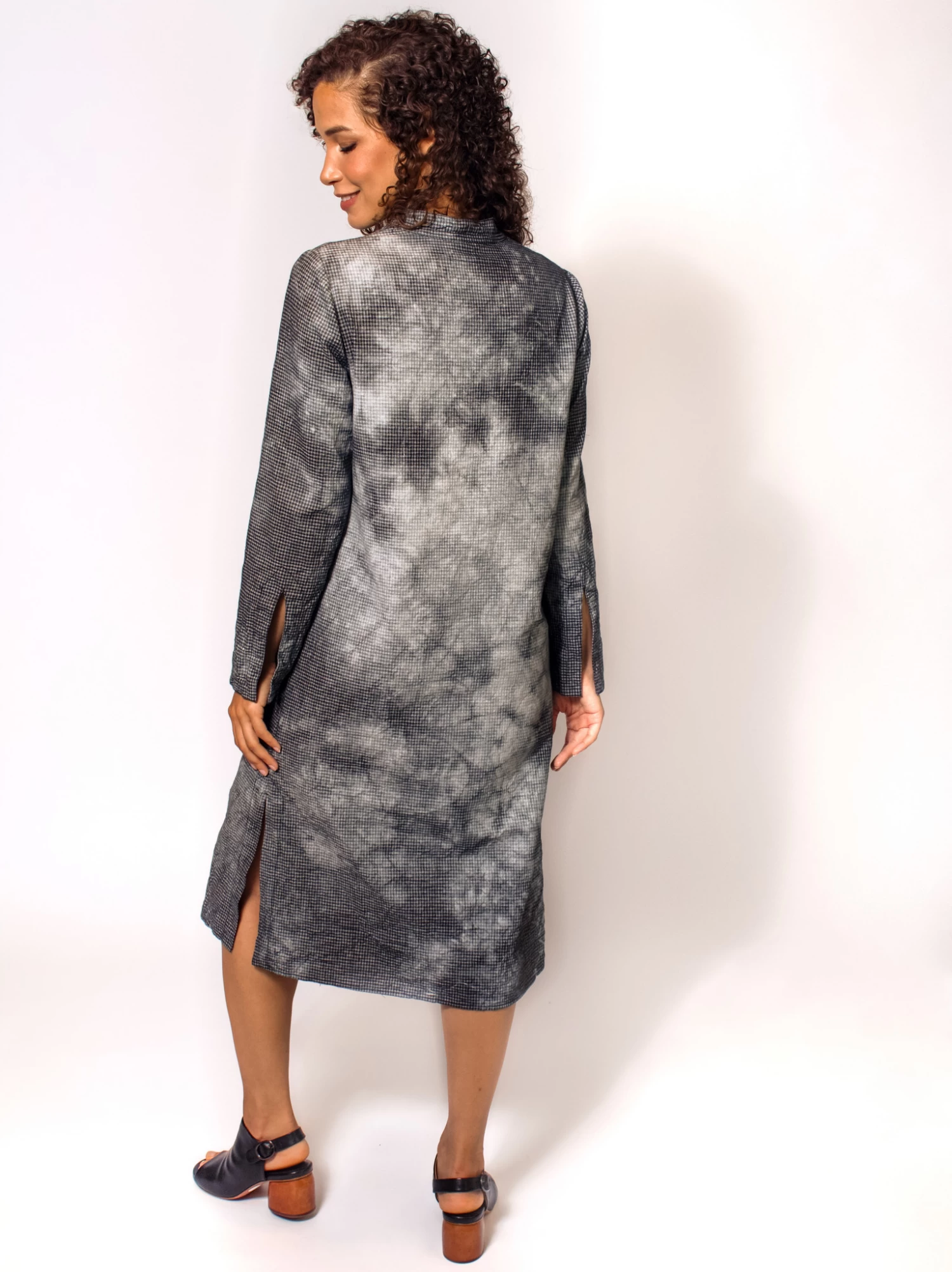 Checkered, tie dyed dress with a button at the neckline and two front pockets.