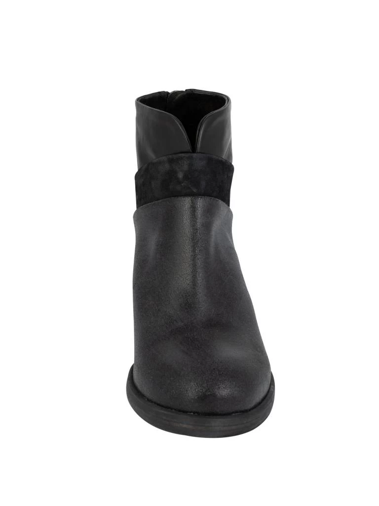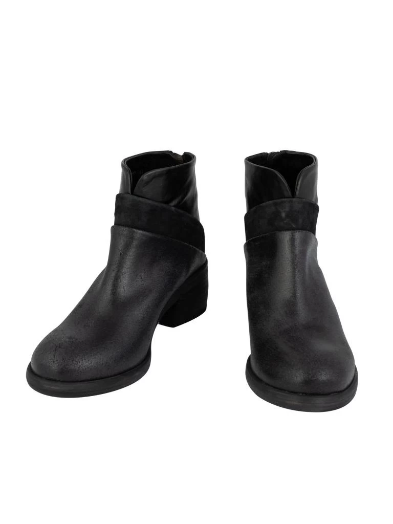A ankle bootie with a contrast textured layer with a V-slit front.