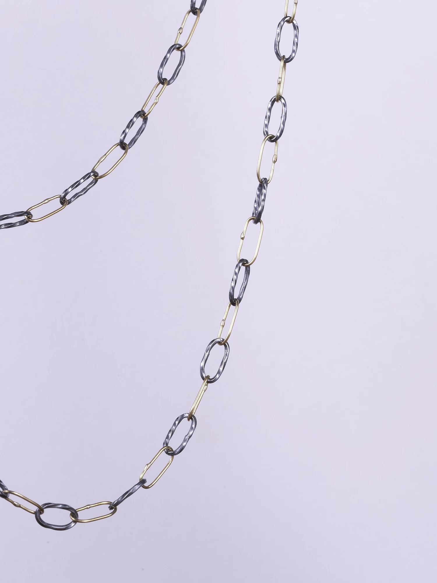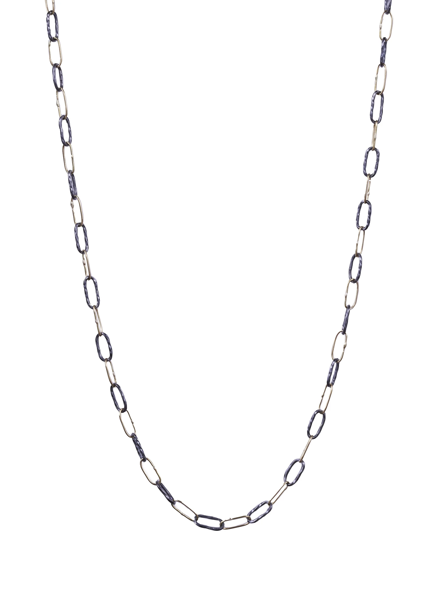 Versatile chain of handmade and twisted 18k and oxidized silver links, with a black diamond bead detail. It can be worn as a necklace at 21″, as a lariat, or wrapped around the wrist 3 times. S-clasp,