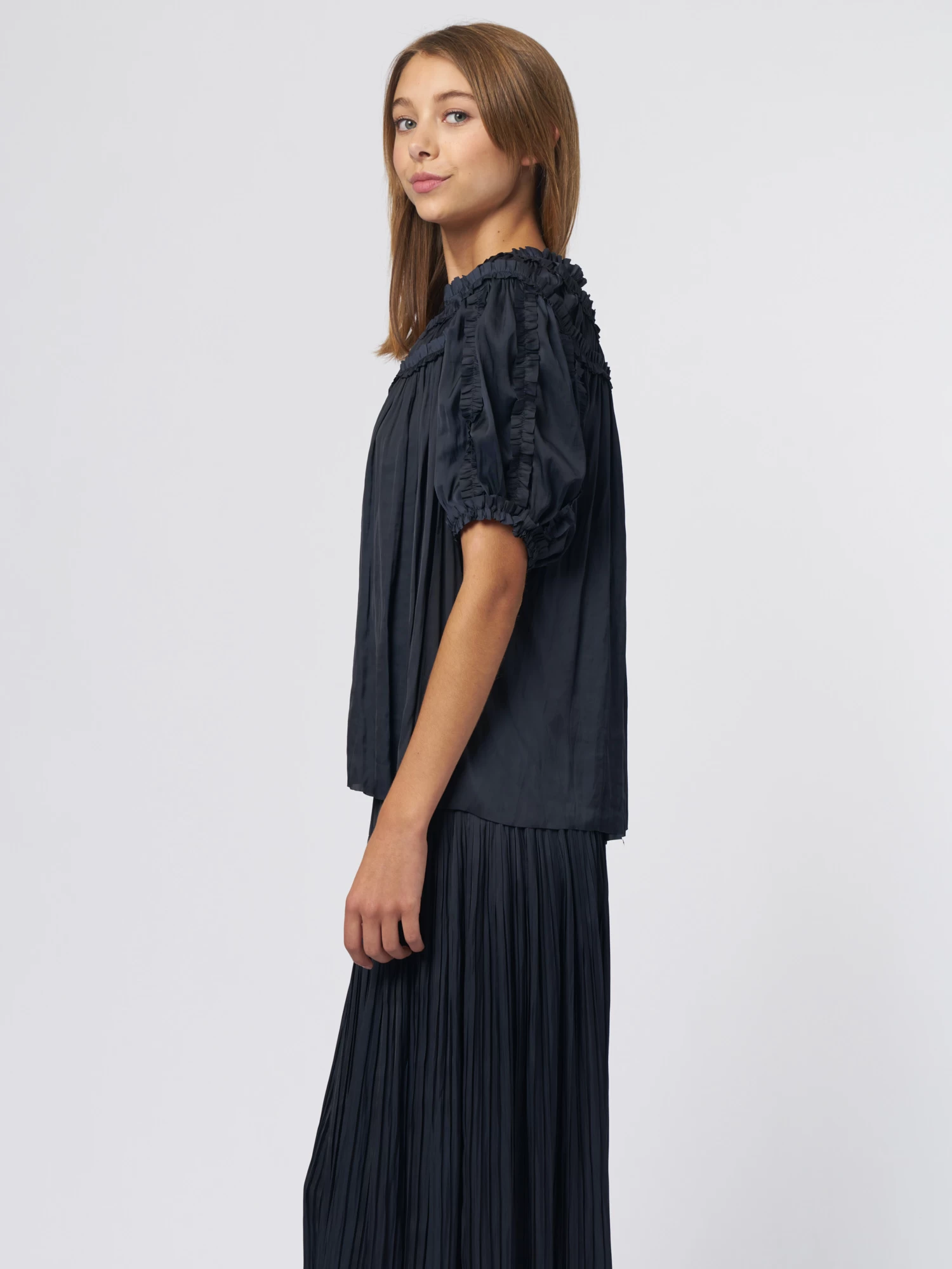 Plisse satin puff sleeve top in Midnight has double-edged ruffles along the sleeves and yoked collar.