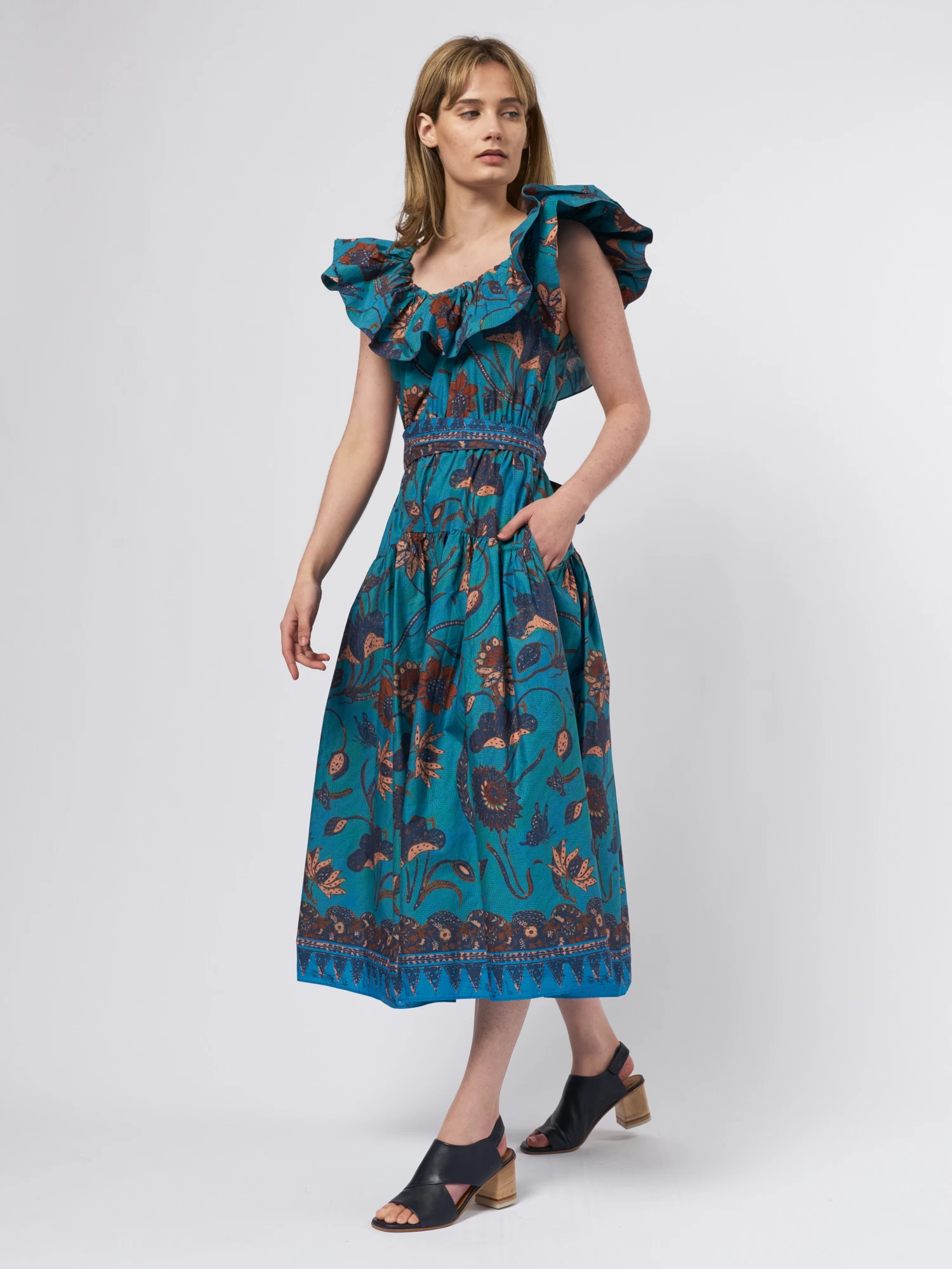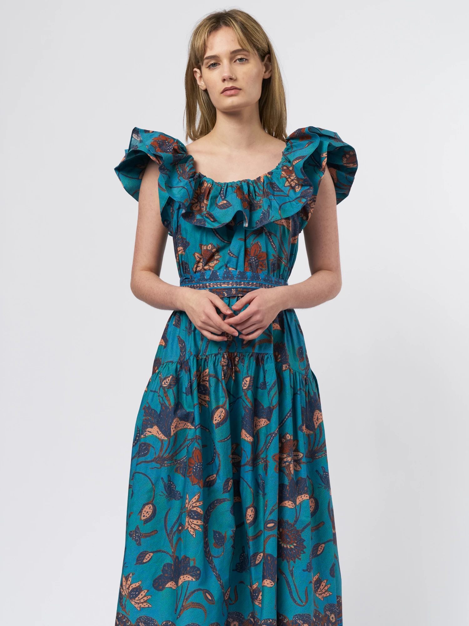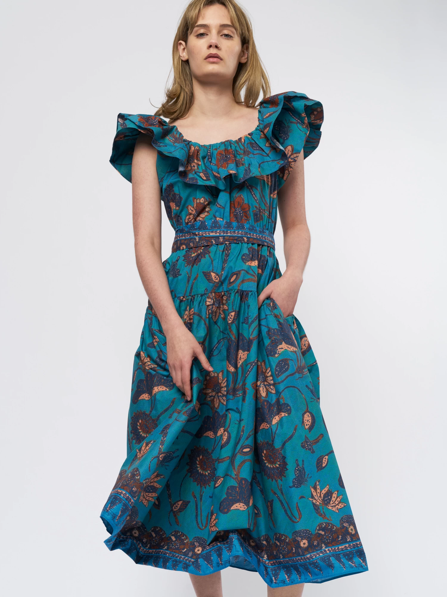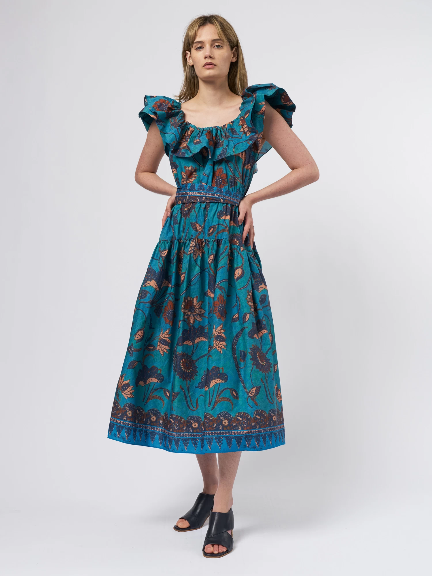 Midi-length dress with a patterned hemline has a ruffled boat neckline and a sashed waistband.