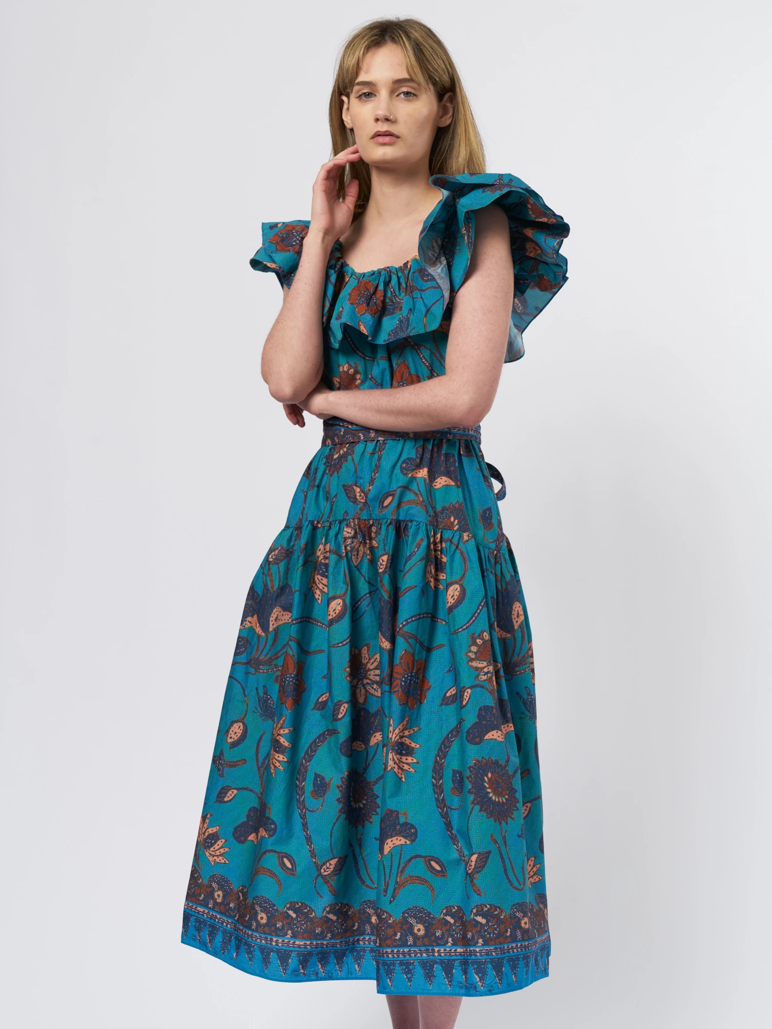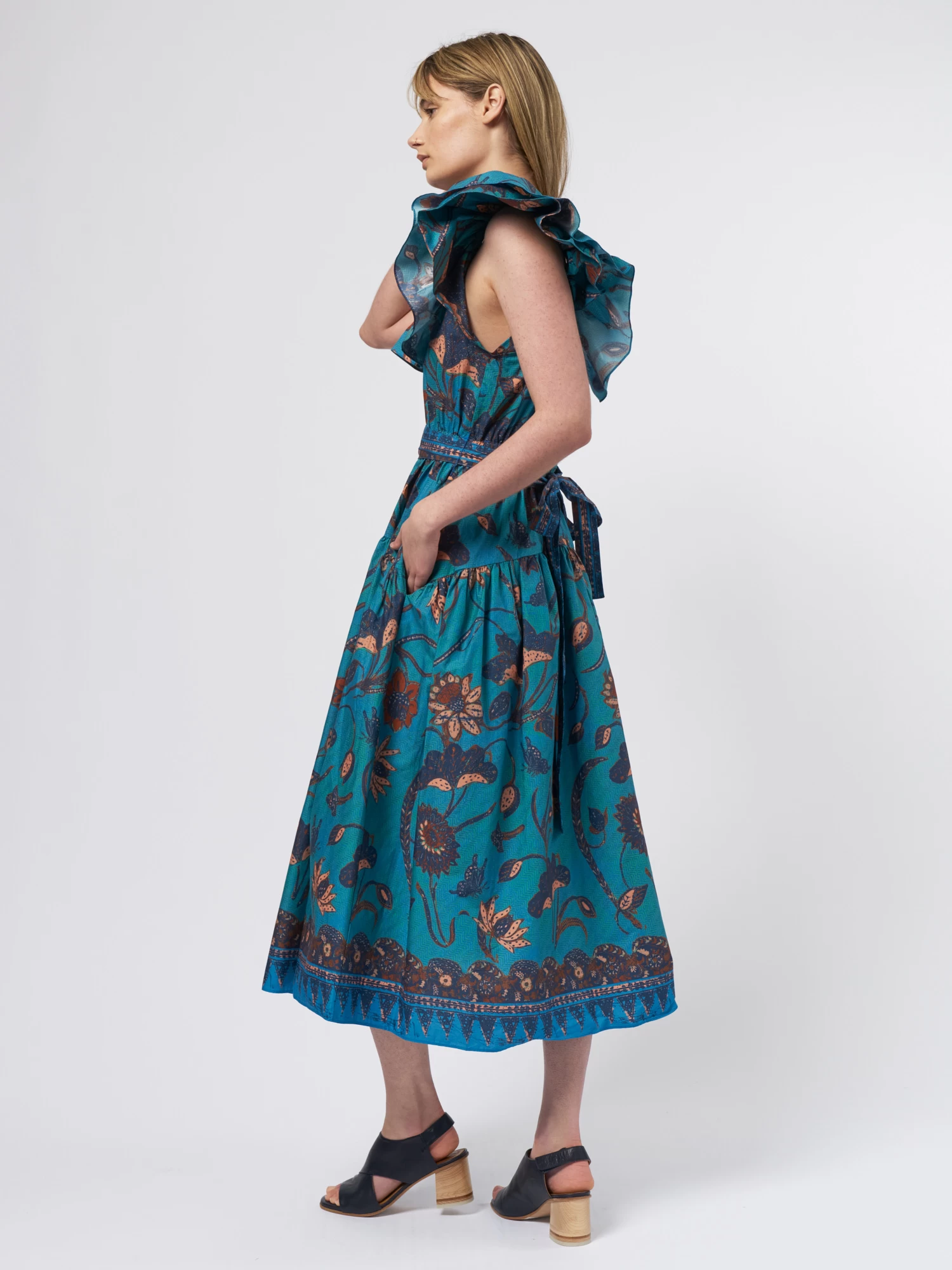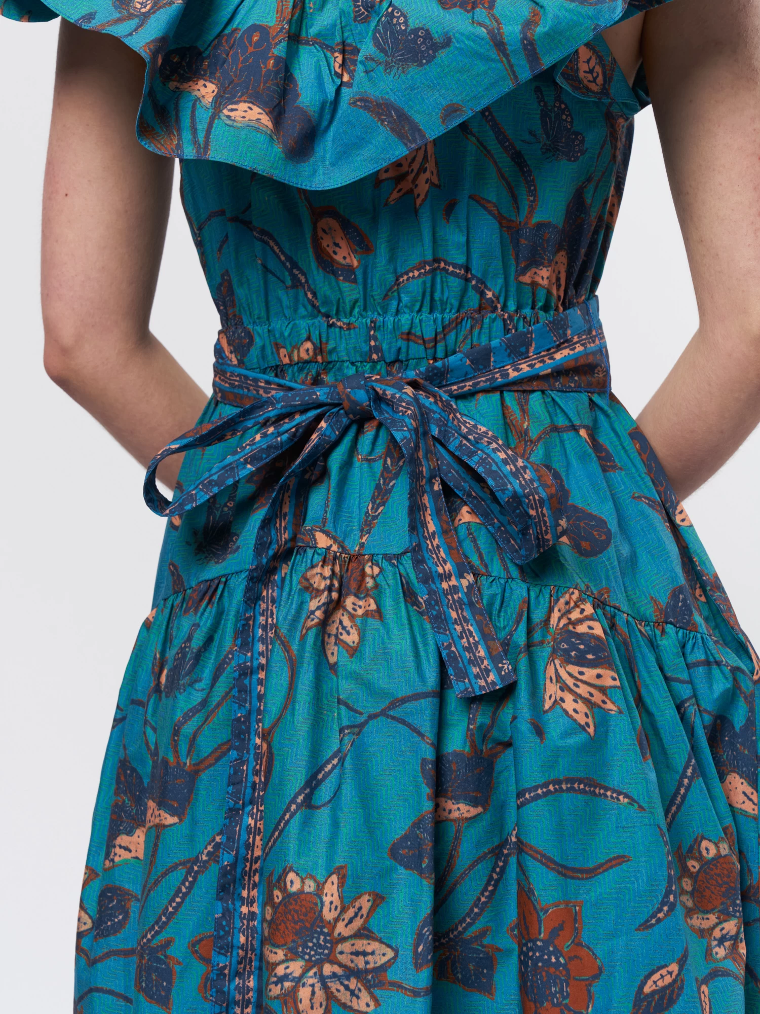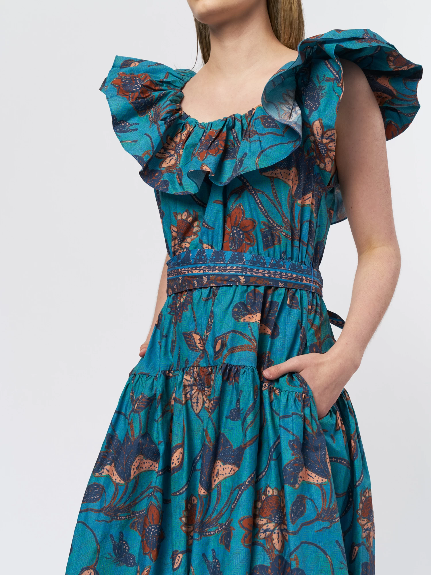 Midi-length dress with a patterned hemline has a ruffled boat neckline and a sashed waistband.