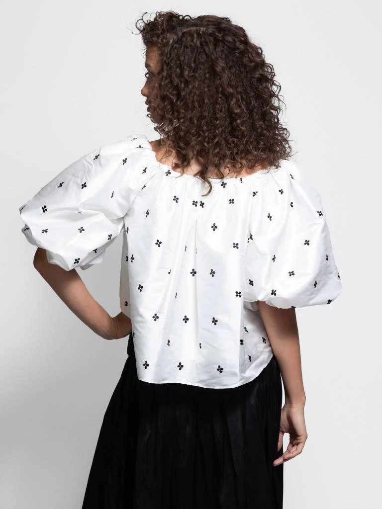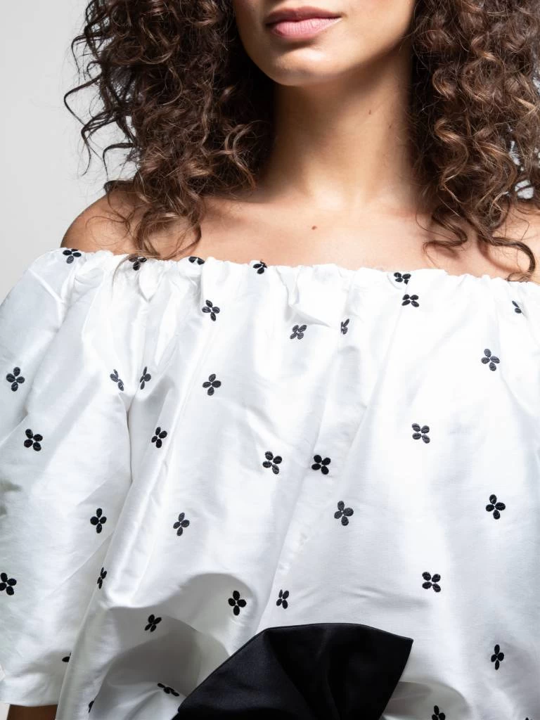 An embroidered, dotted top with puff, off-the-shoulder sleeves.
