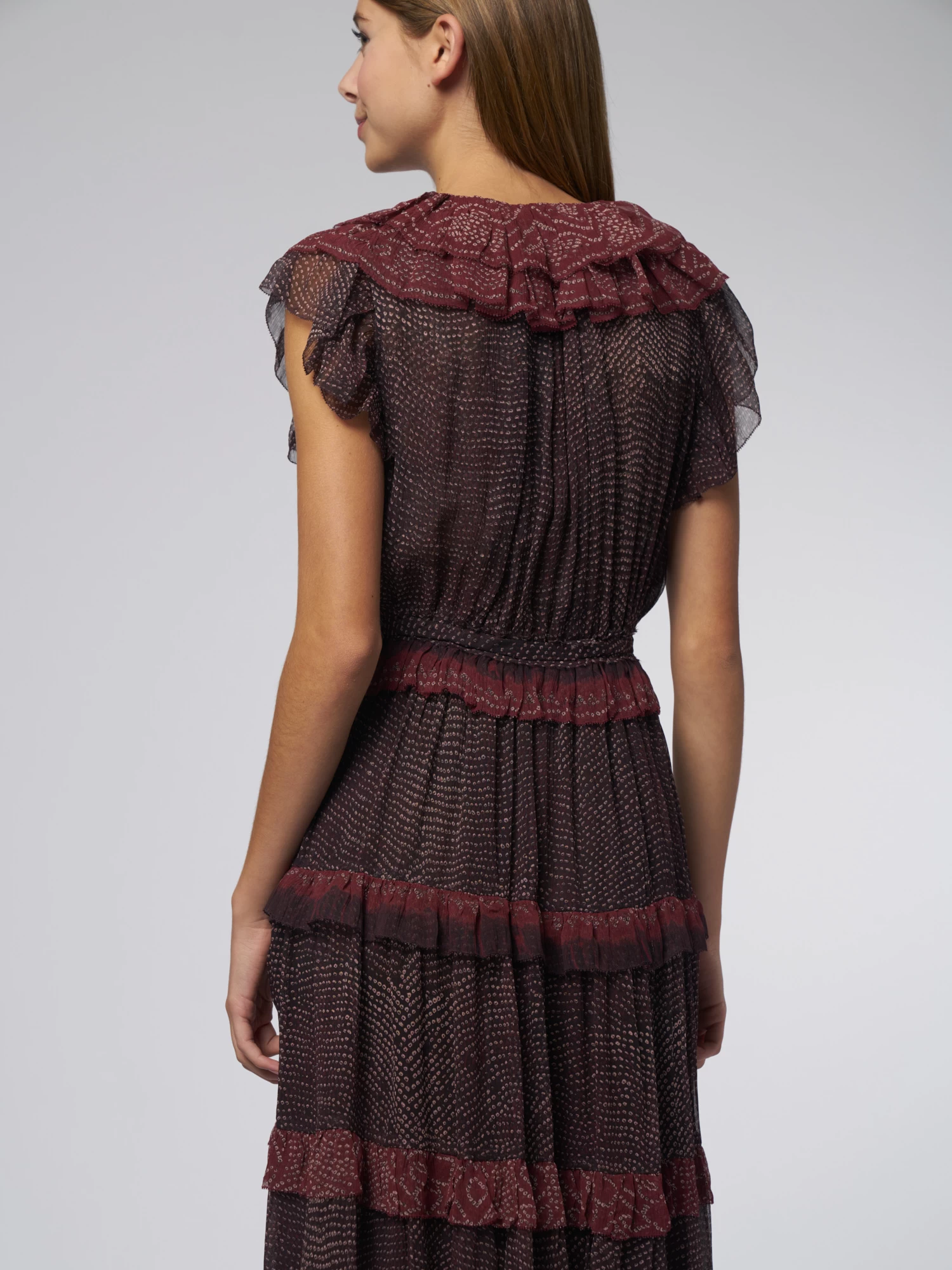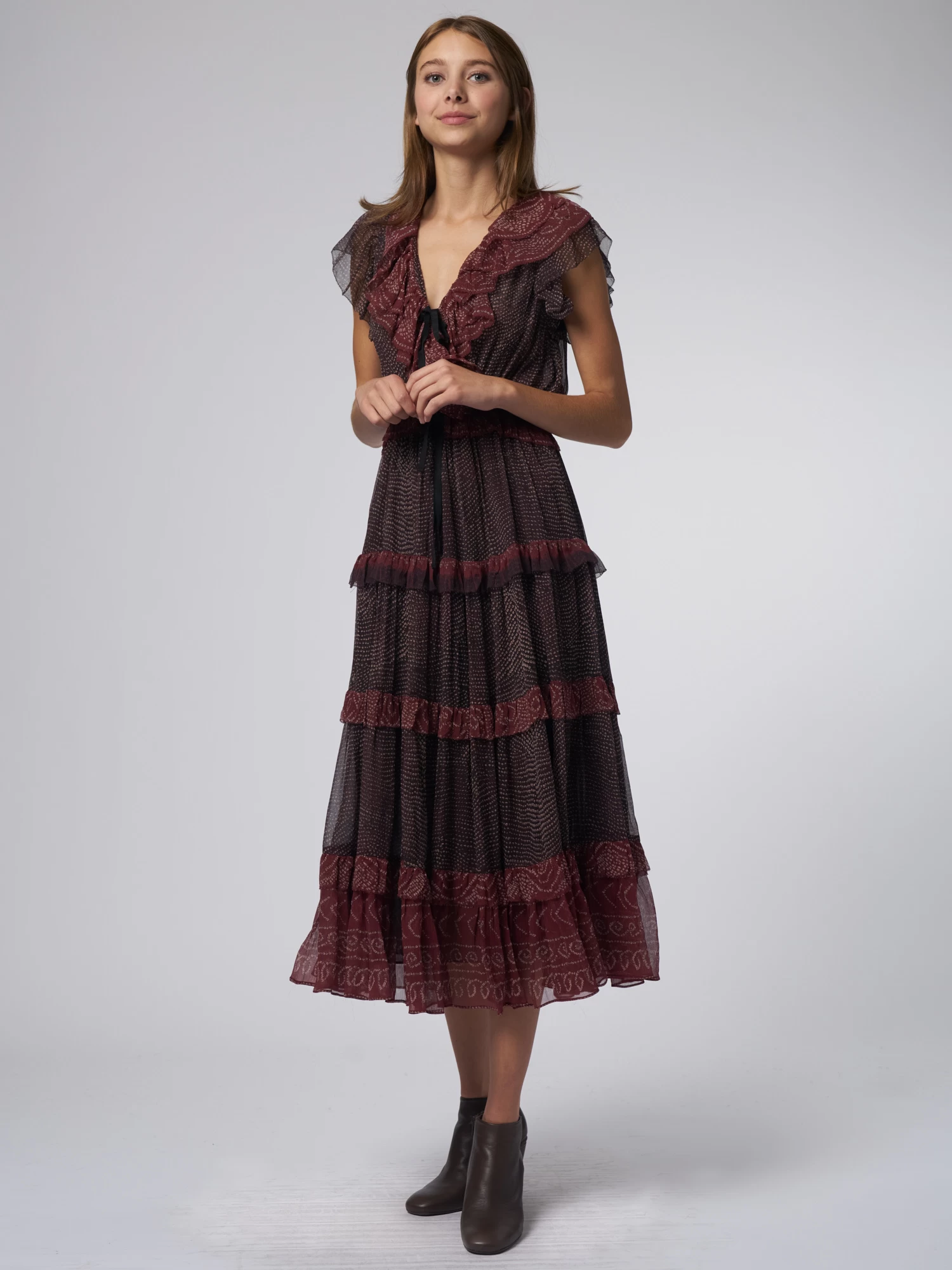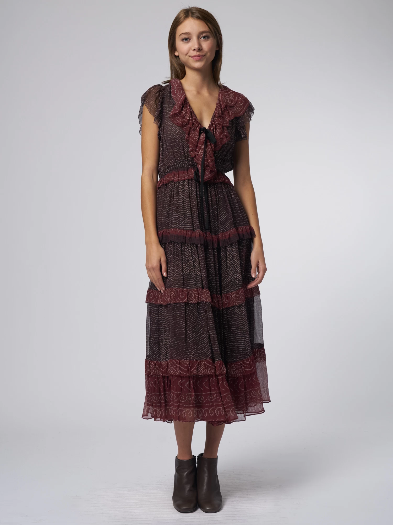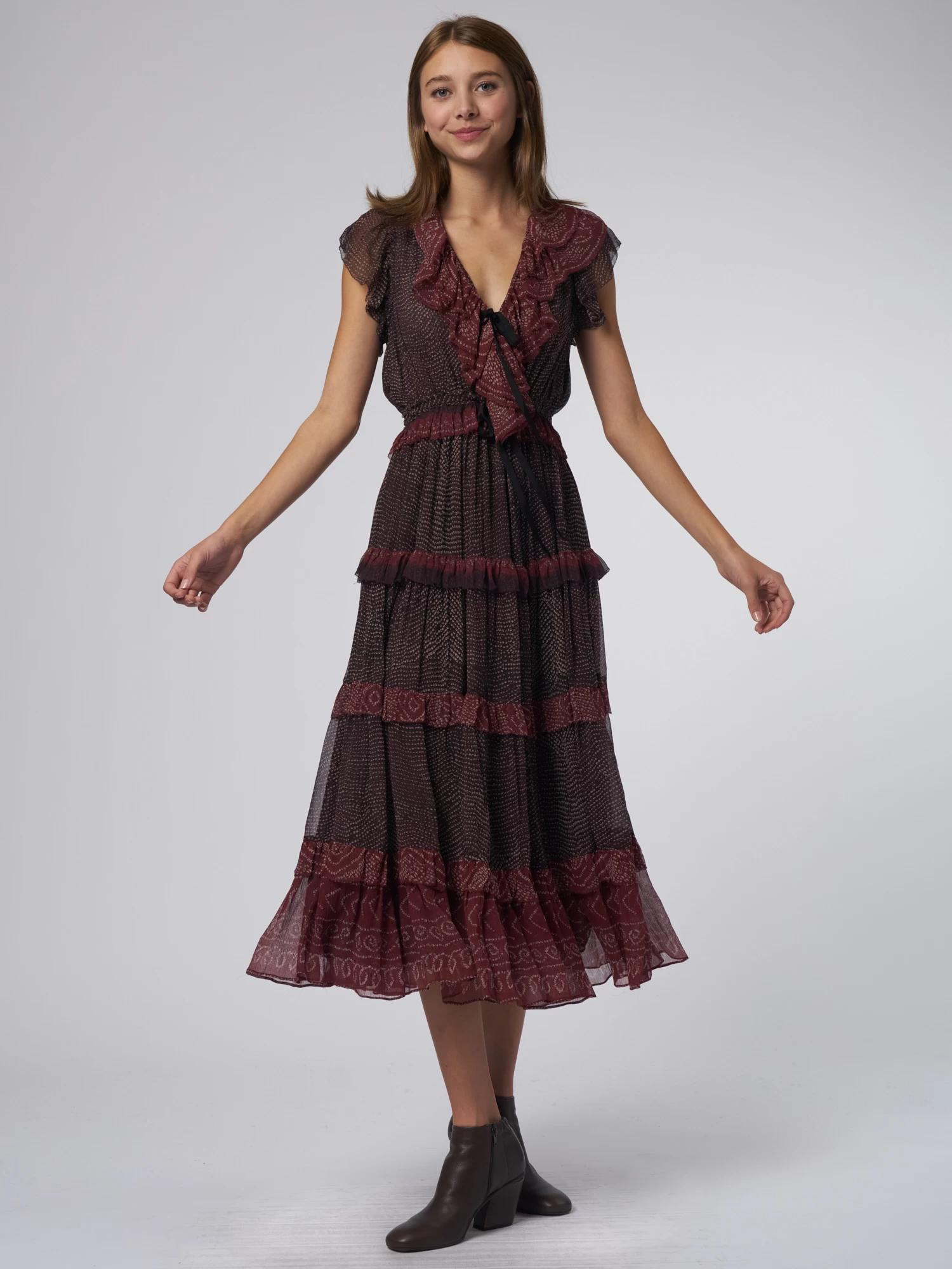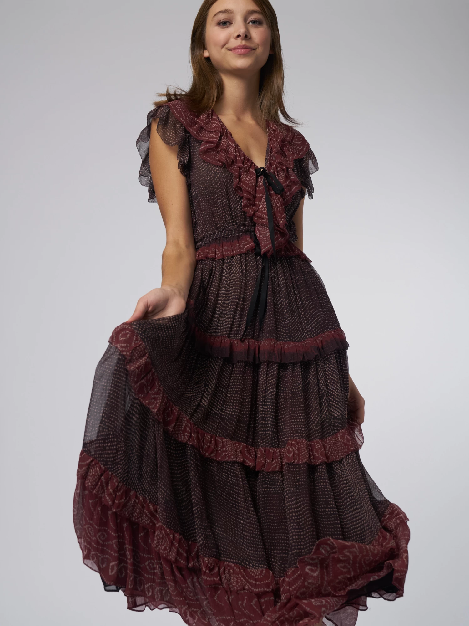 This midi-length crinkle chiffon dress features an elastic waist and a full, tiered skirt in deep jewel tones of patchworked burgundy
