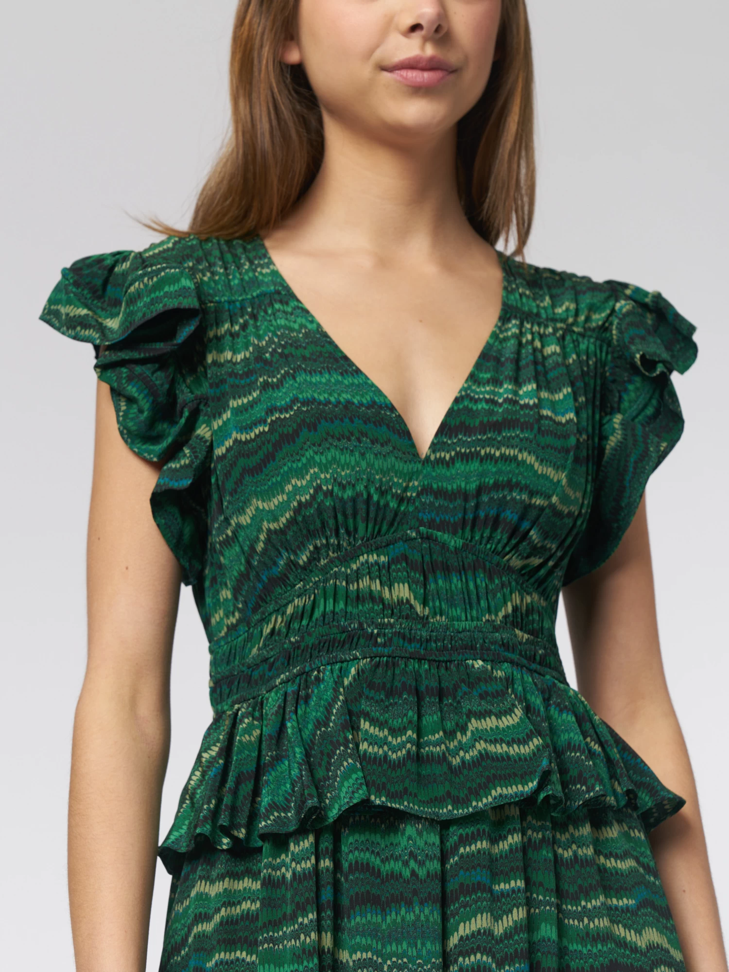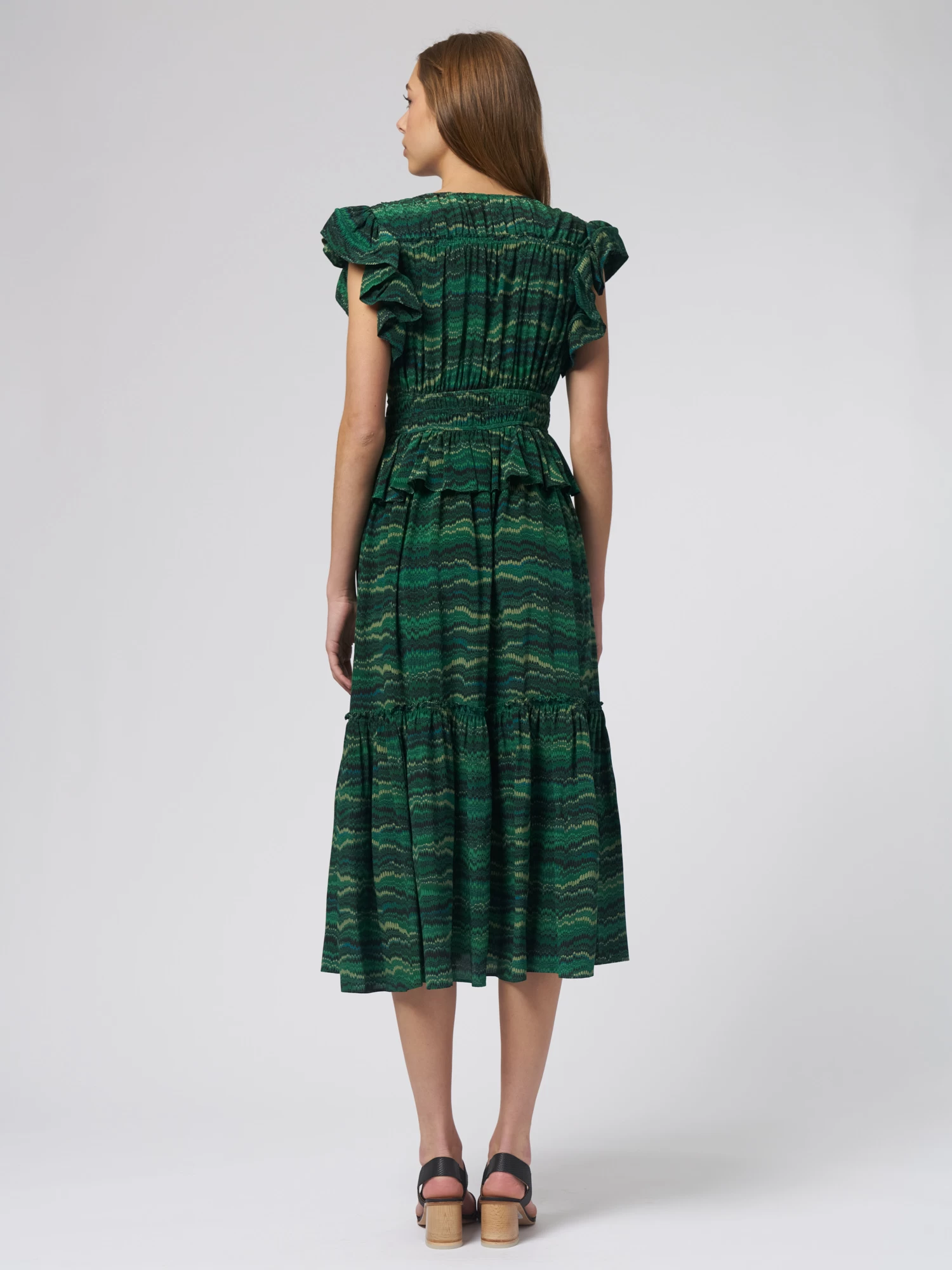 Printed silk midi-length dress in a gradient pattern of forest and Kelly green has a tiered skirt, cinched waist, flutter sleeves, and intricate ruching along the neckline