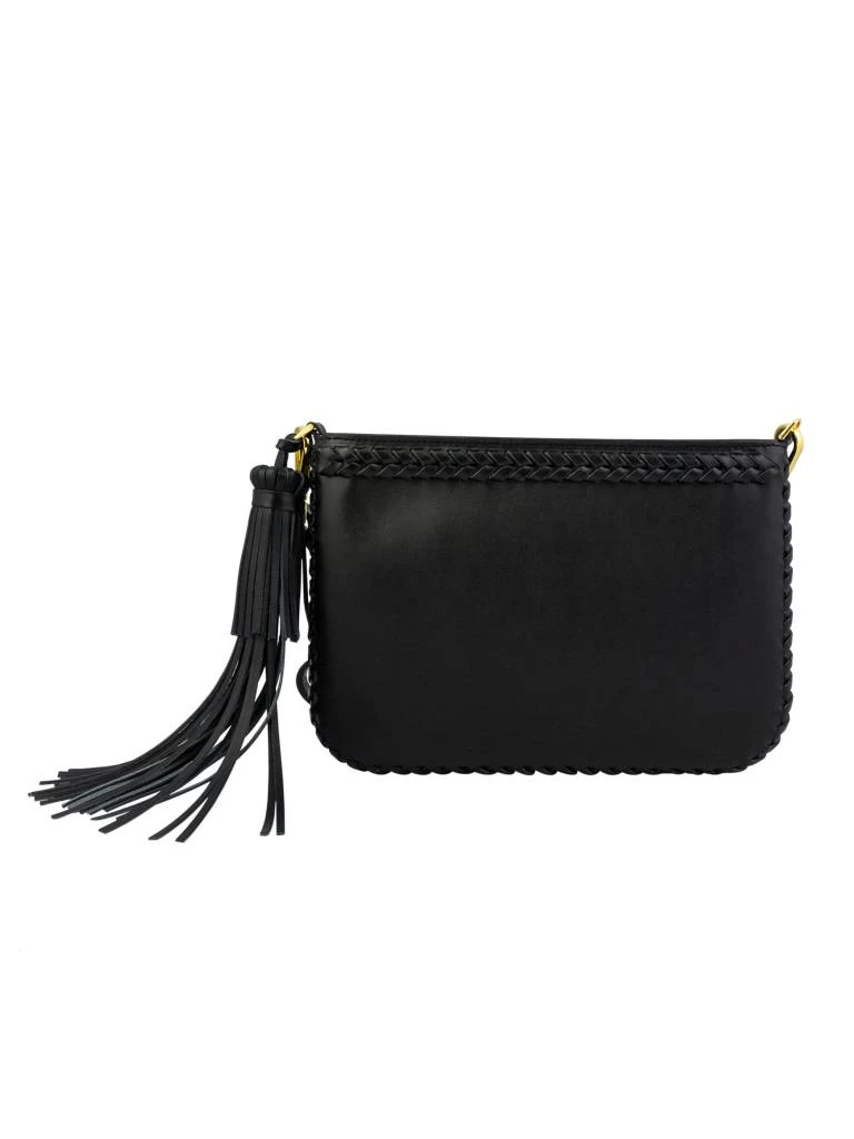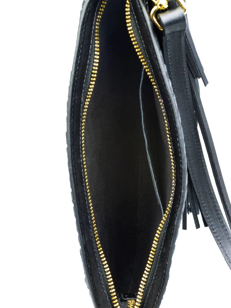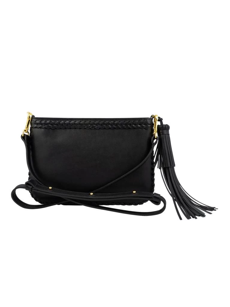 A hand whip-stitched shoulder bag with leather tassels and detachable strap.
