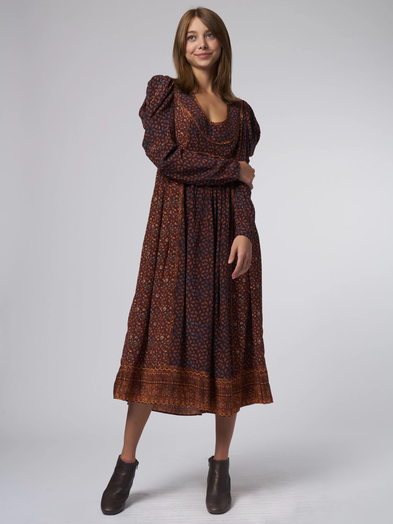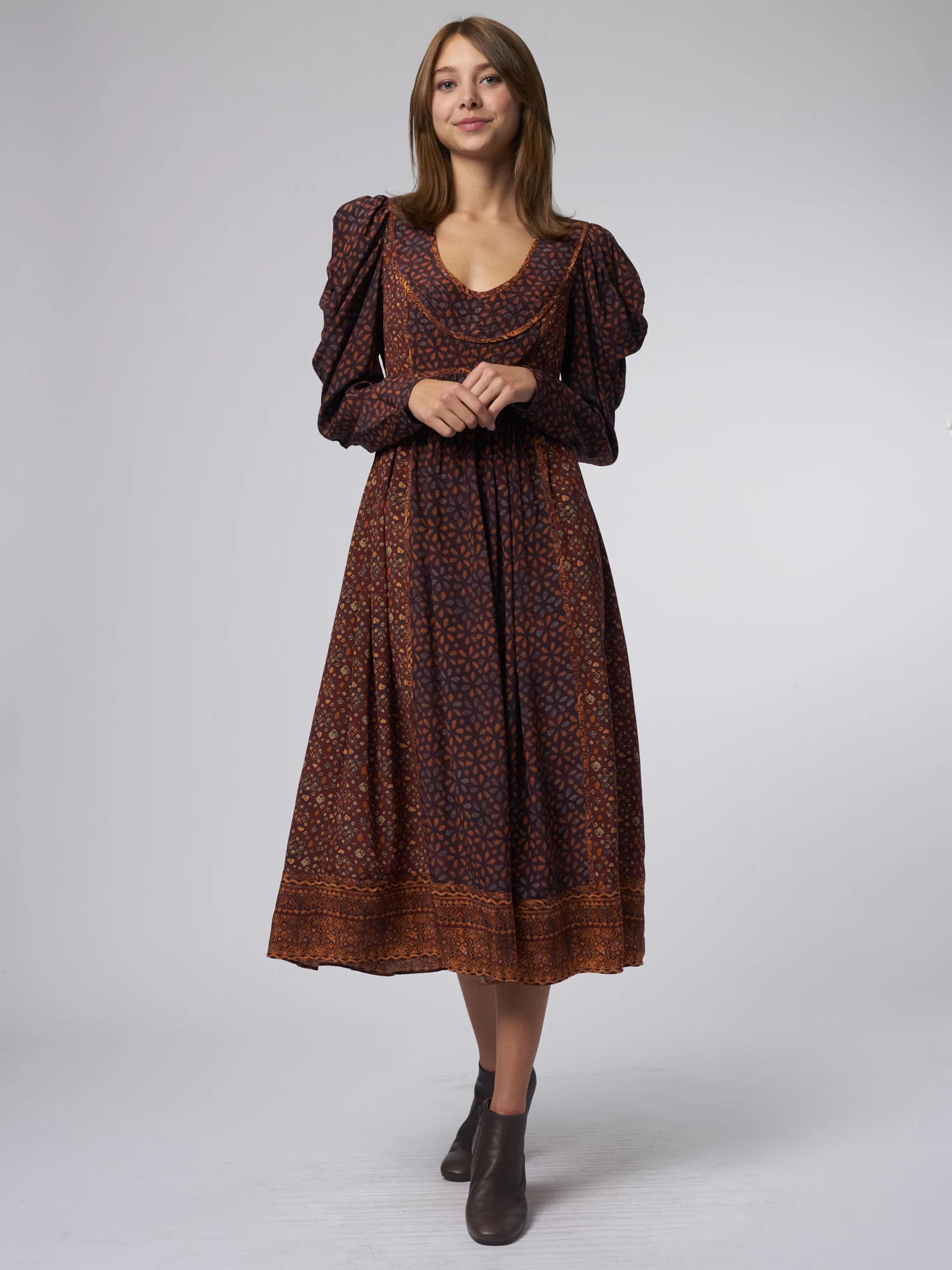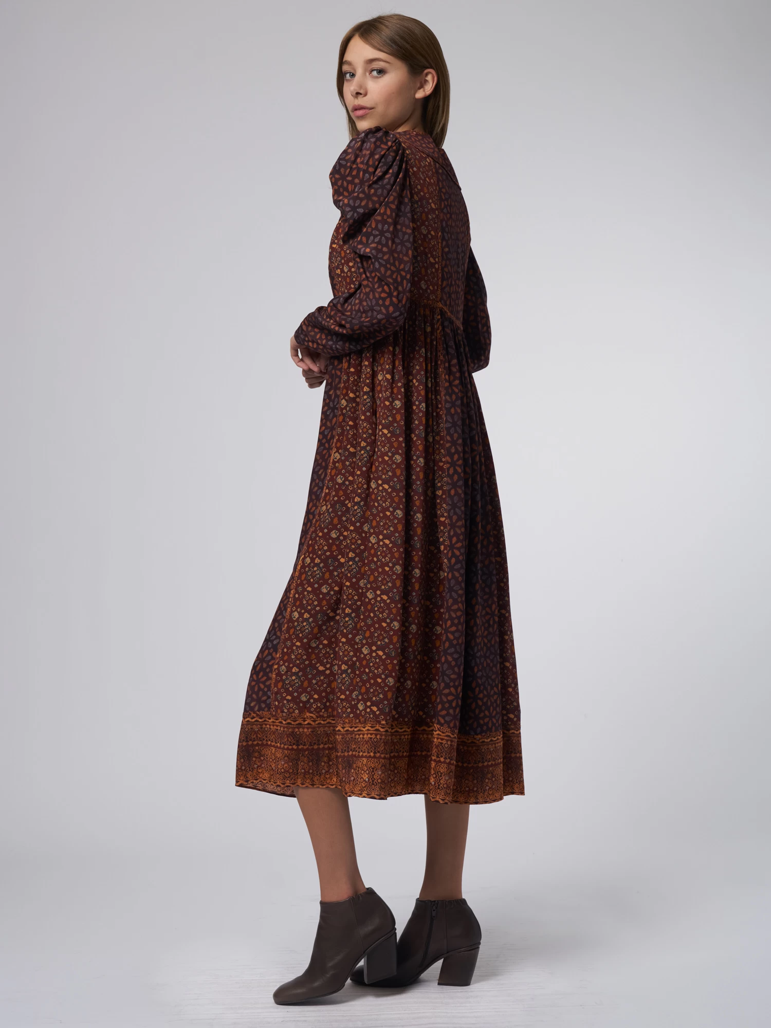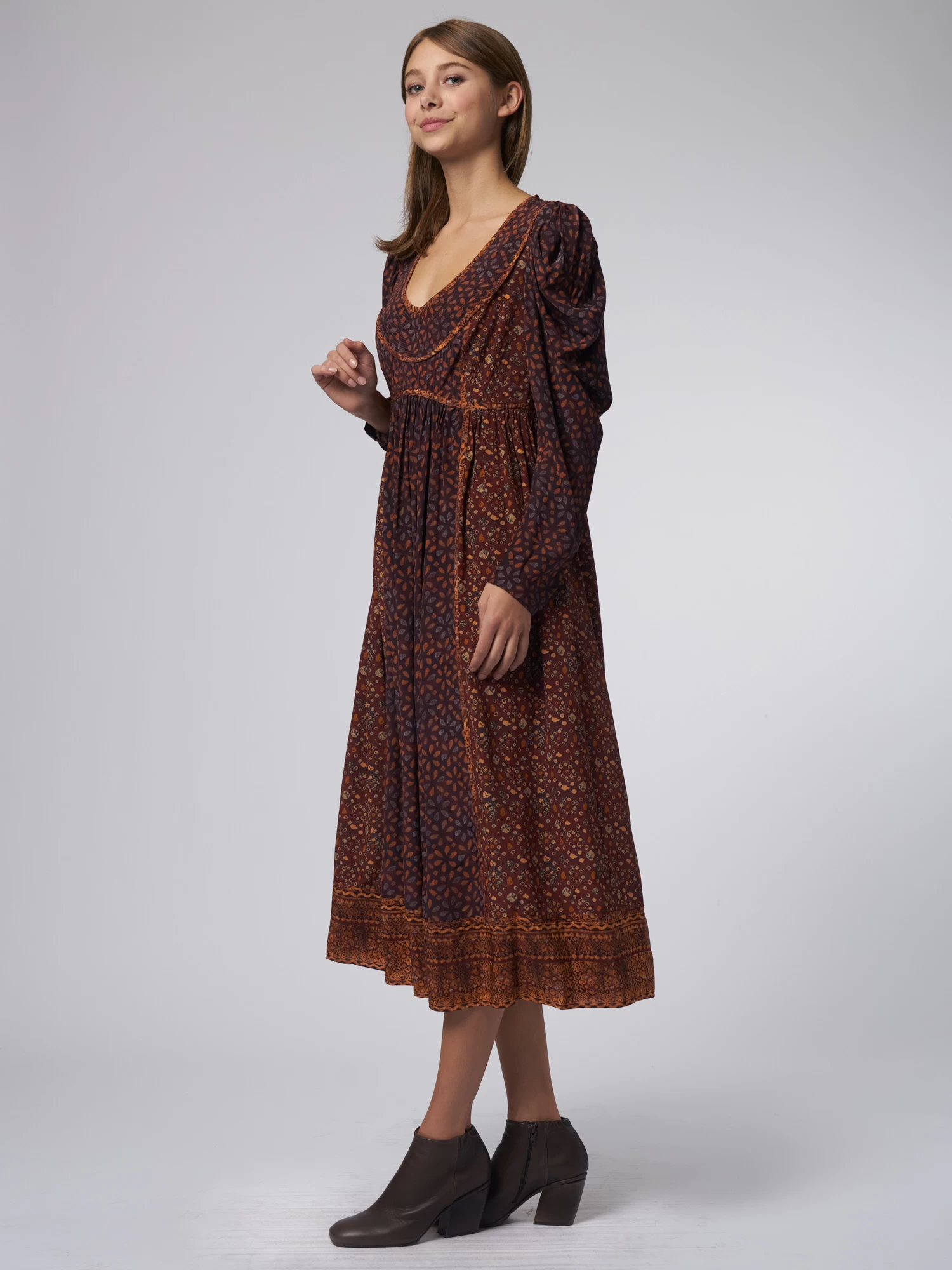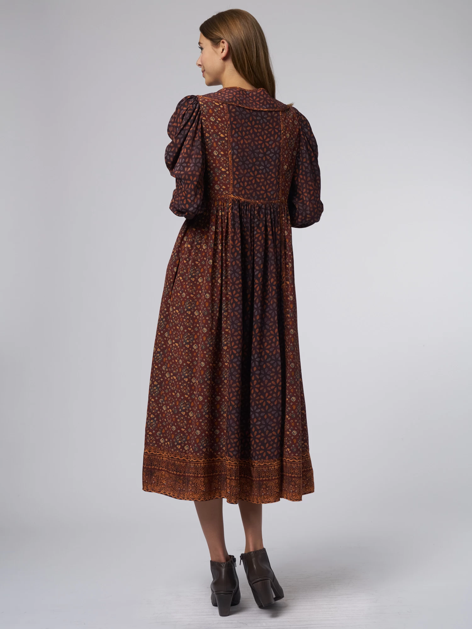 The shibori-inspired patterns silk dress features a detailed collar and empire waist that contrast along the hemline and waist.