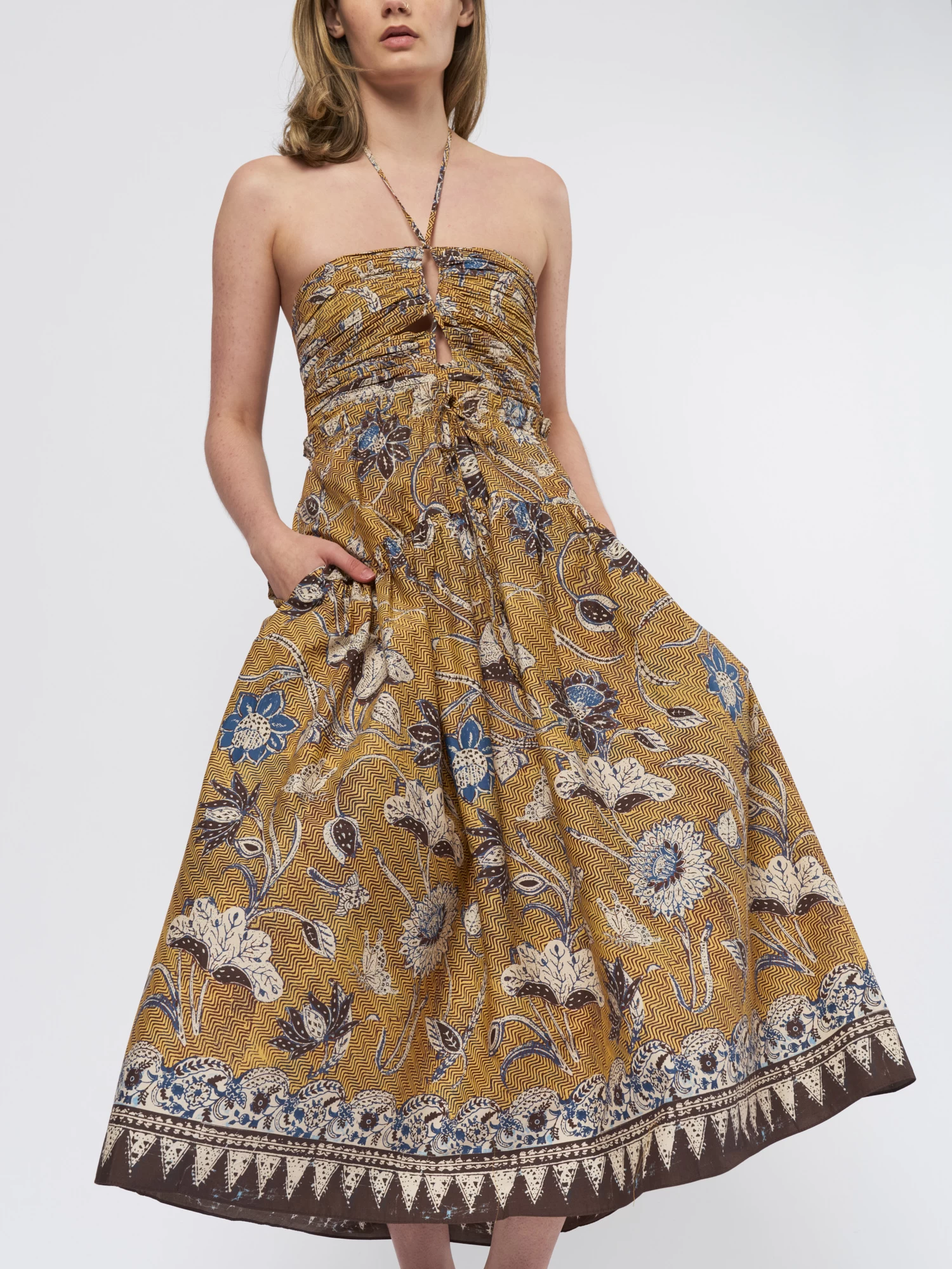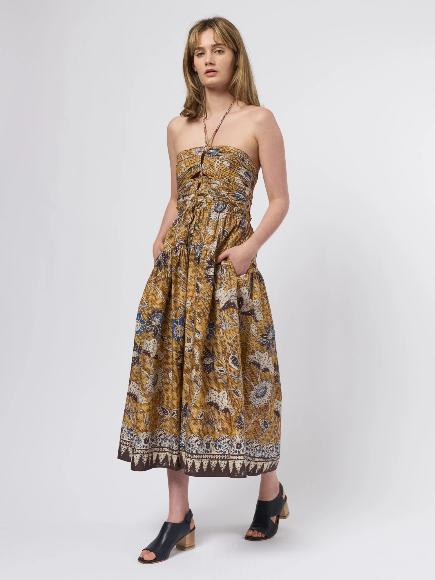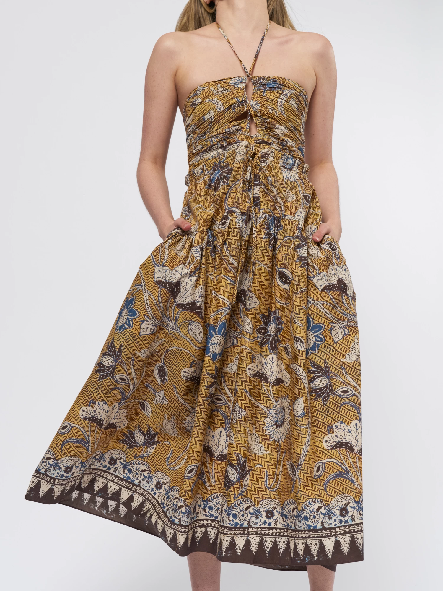 The midi dress features a ruched bodice featuring keyhole openings at its center, a full gathered skirt, and hidden side-seam pockets.