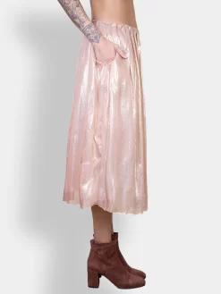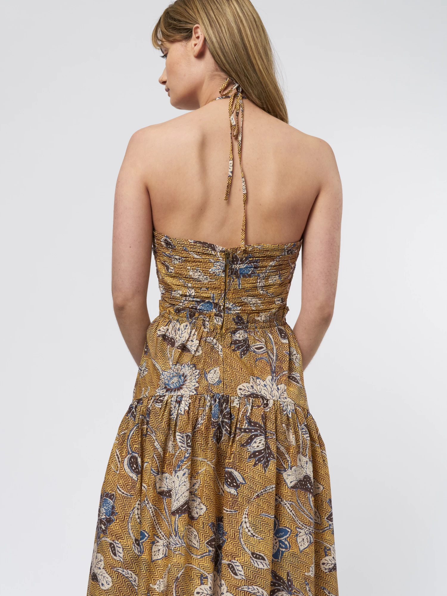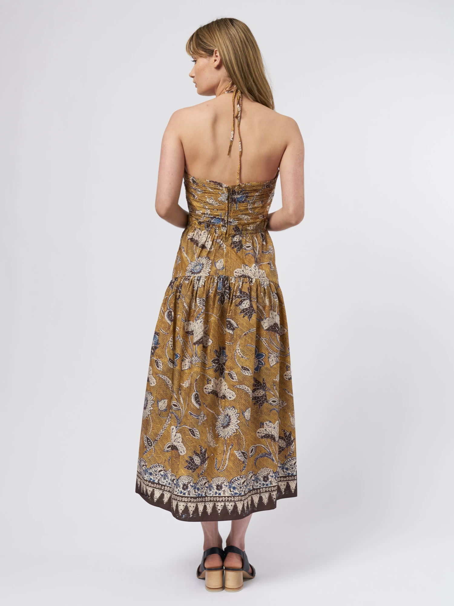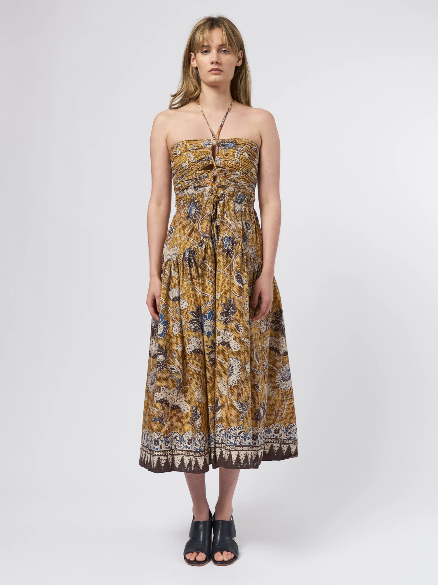 The midi dress features a ruched bodice featuring keyhole openings at its center, a full gathered skirt, and hidden side-seam pockets.
