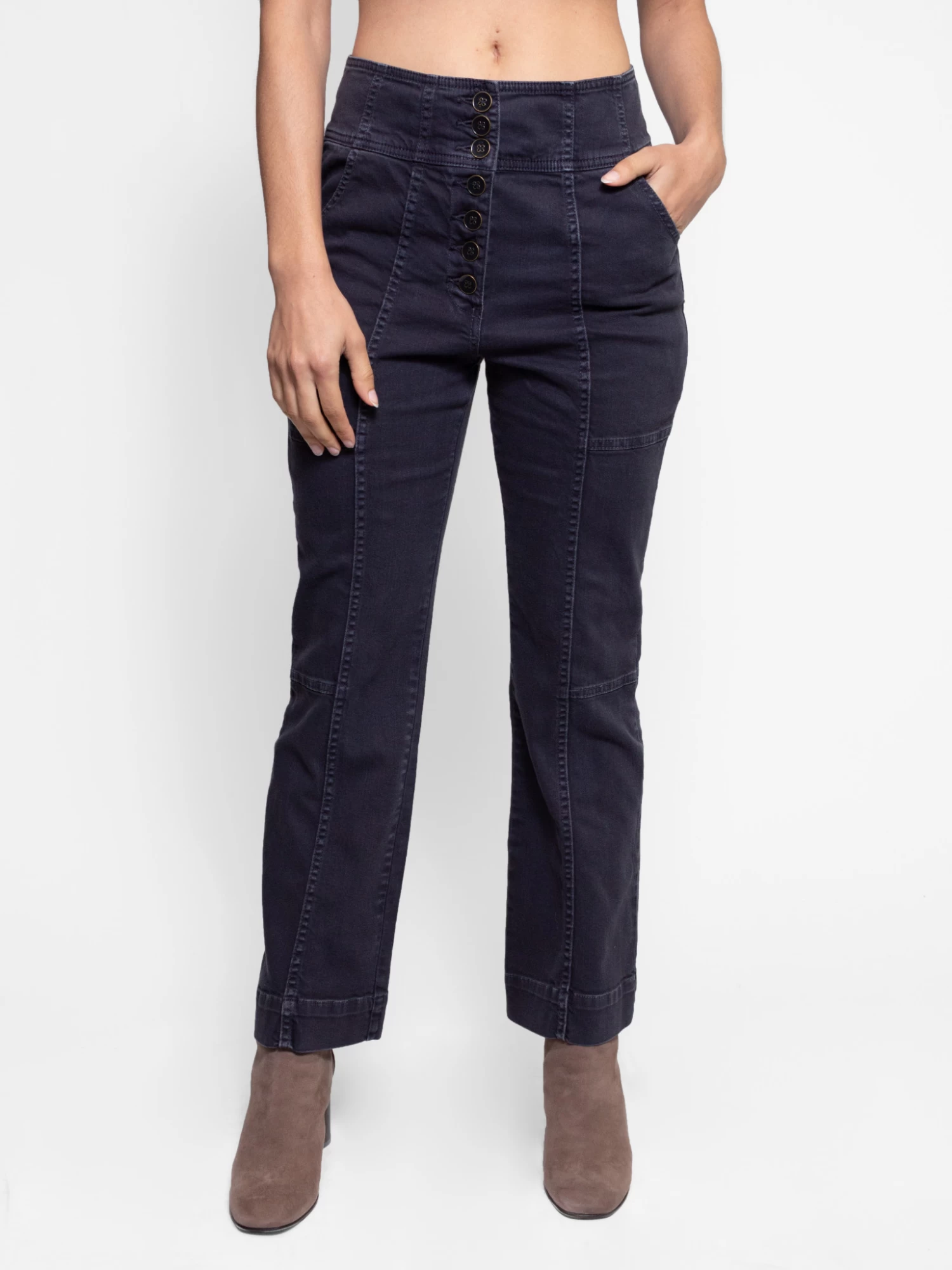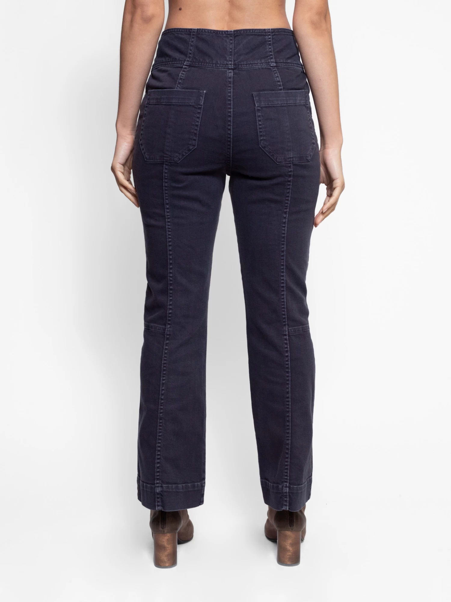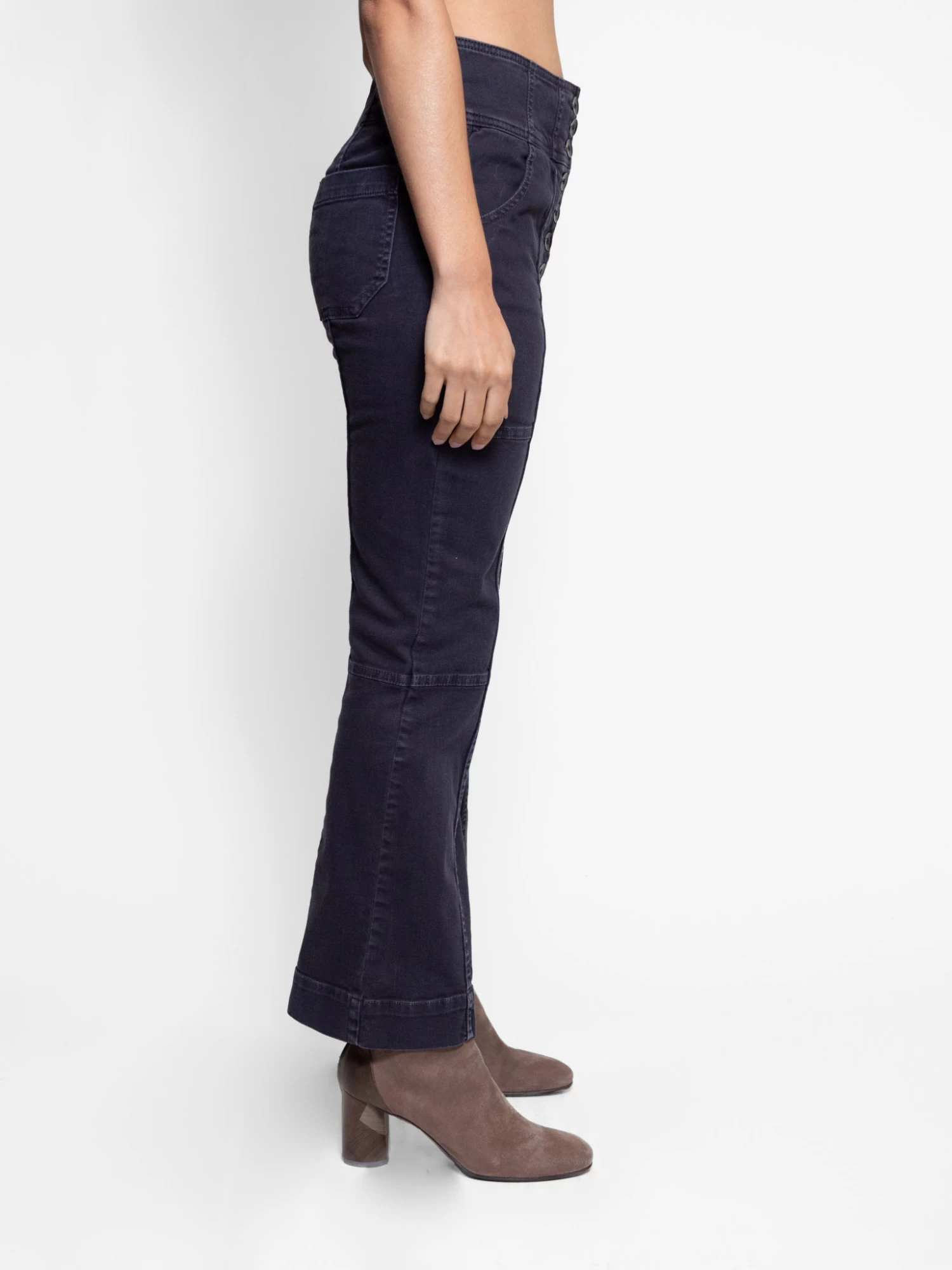 A cropped jean featuring patchwork detailing, a button fly, high waist, pockets. and a kick flair in hand painted, acid wash charcoal denim.
