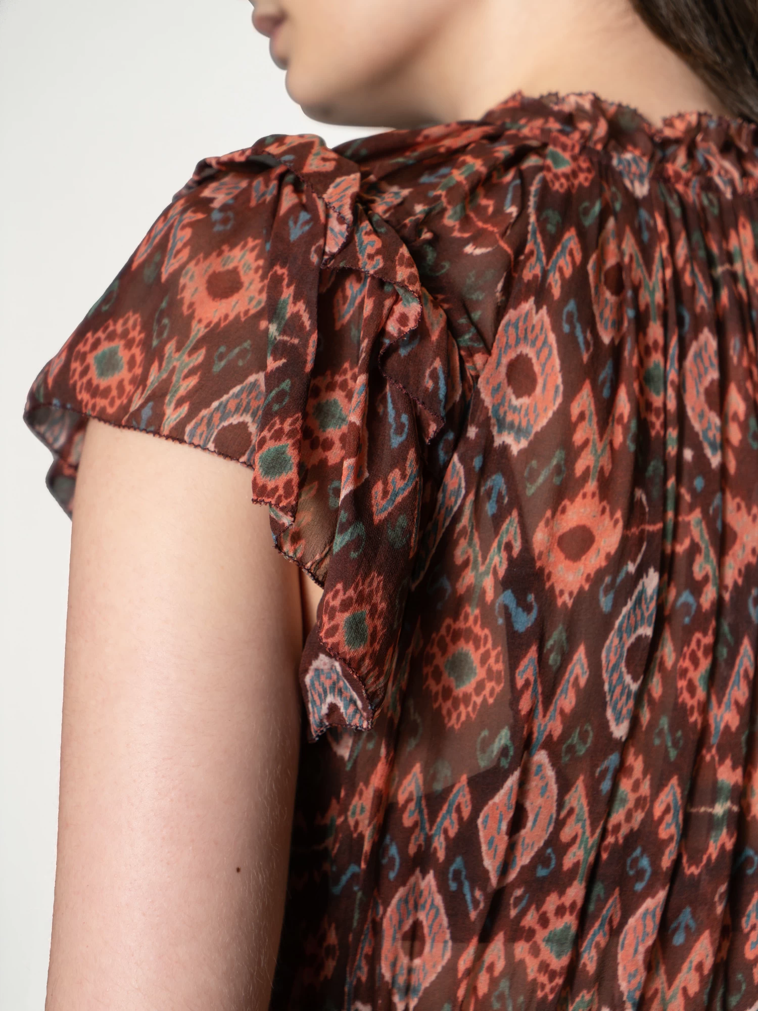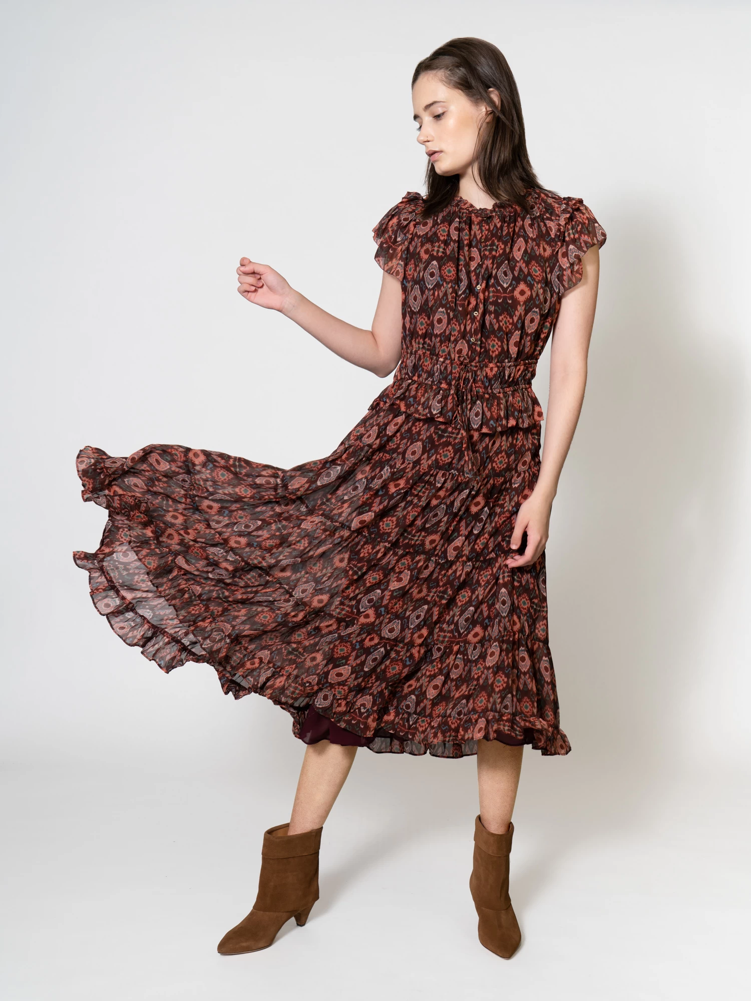 Ikat’s printed silk-georgette dress has mini ruffles along the sleeves and an elastic, sinched waistband. Midi-length dress features a tiered skirt with gathered seams for extra movement and volume.