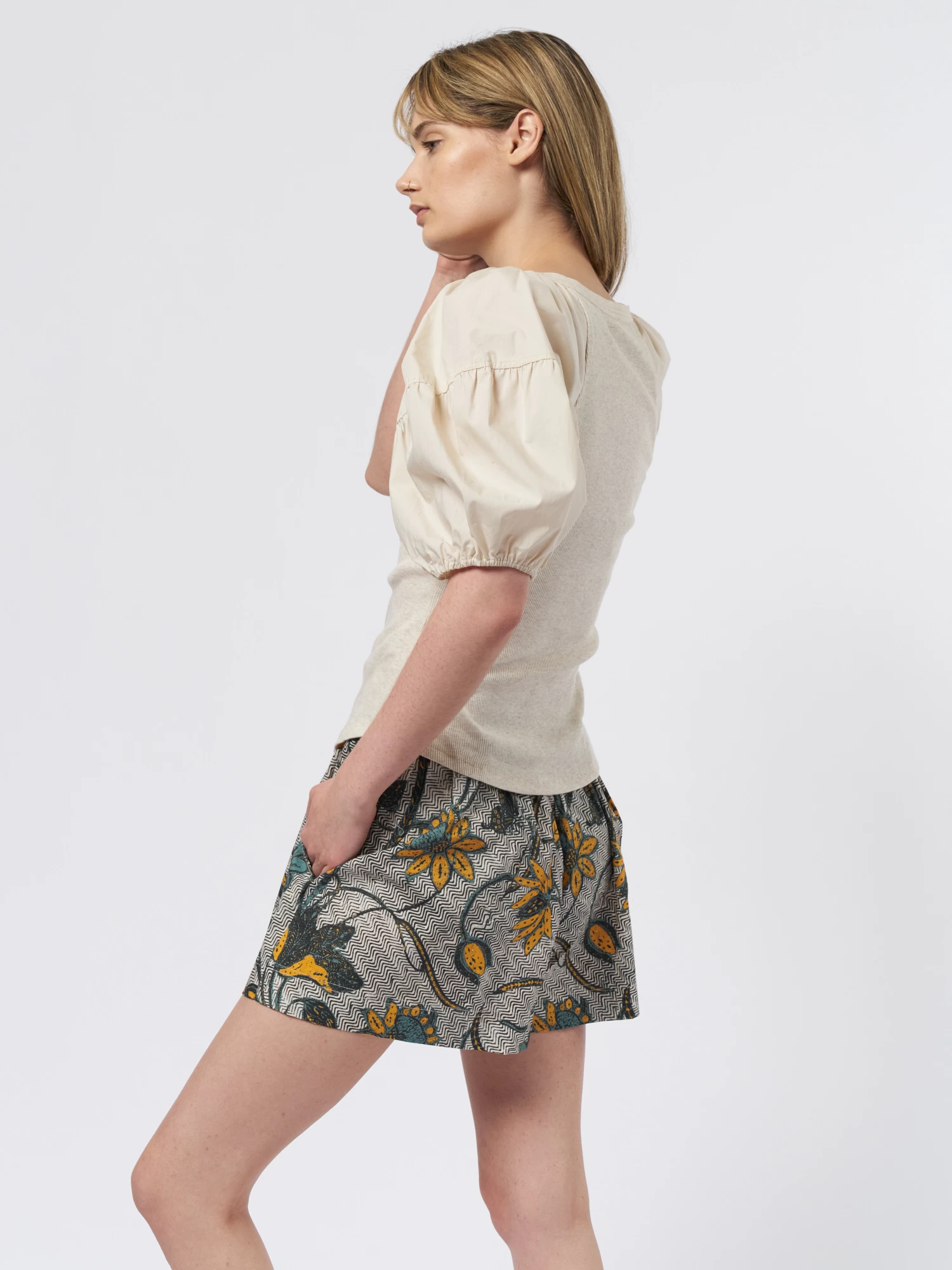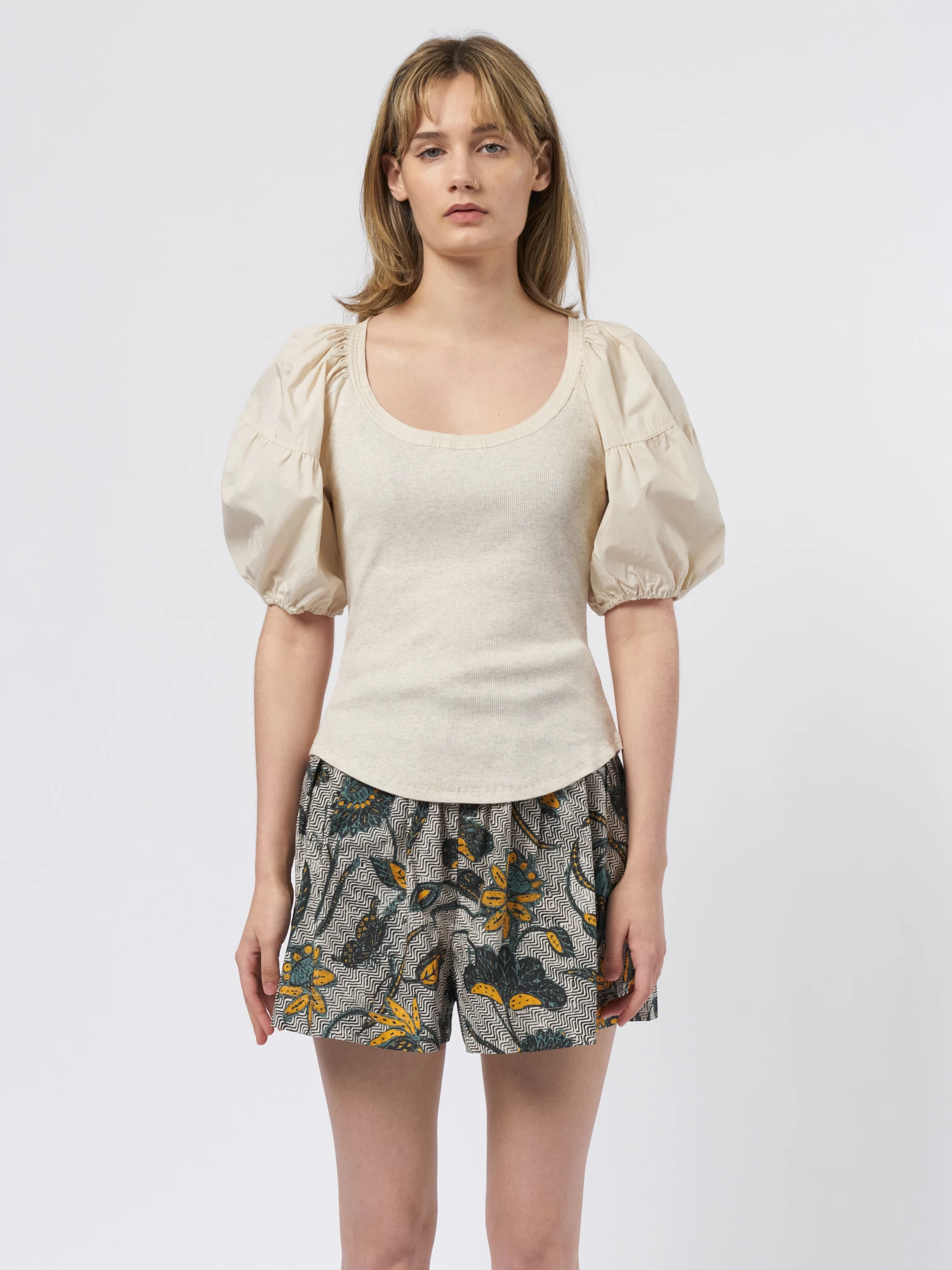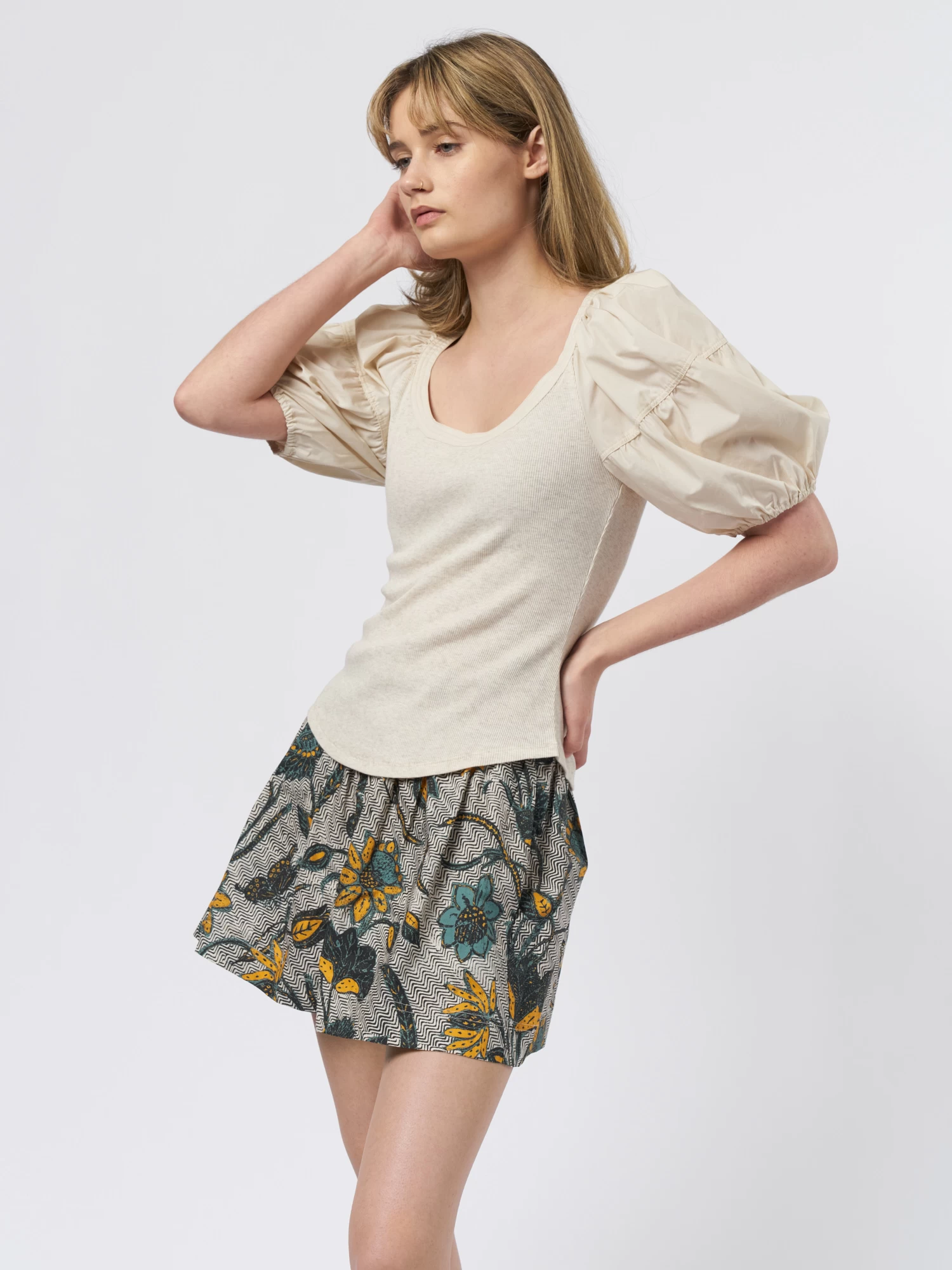 It is designed in a combination of cotton poplin and fine ribbed knit. It has a dramatic scoop neck and fitted bodice to balance out the voluminous sleeves.