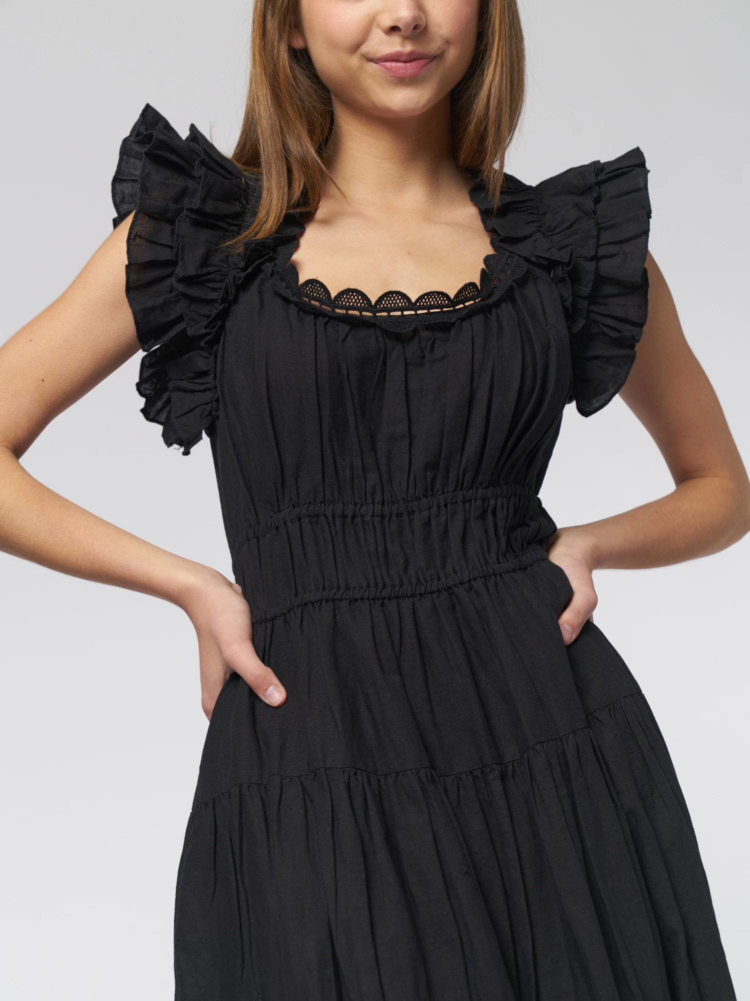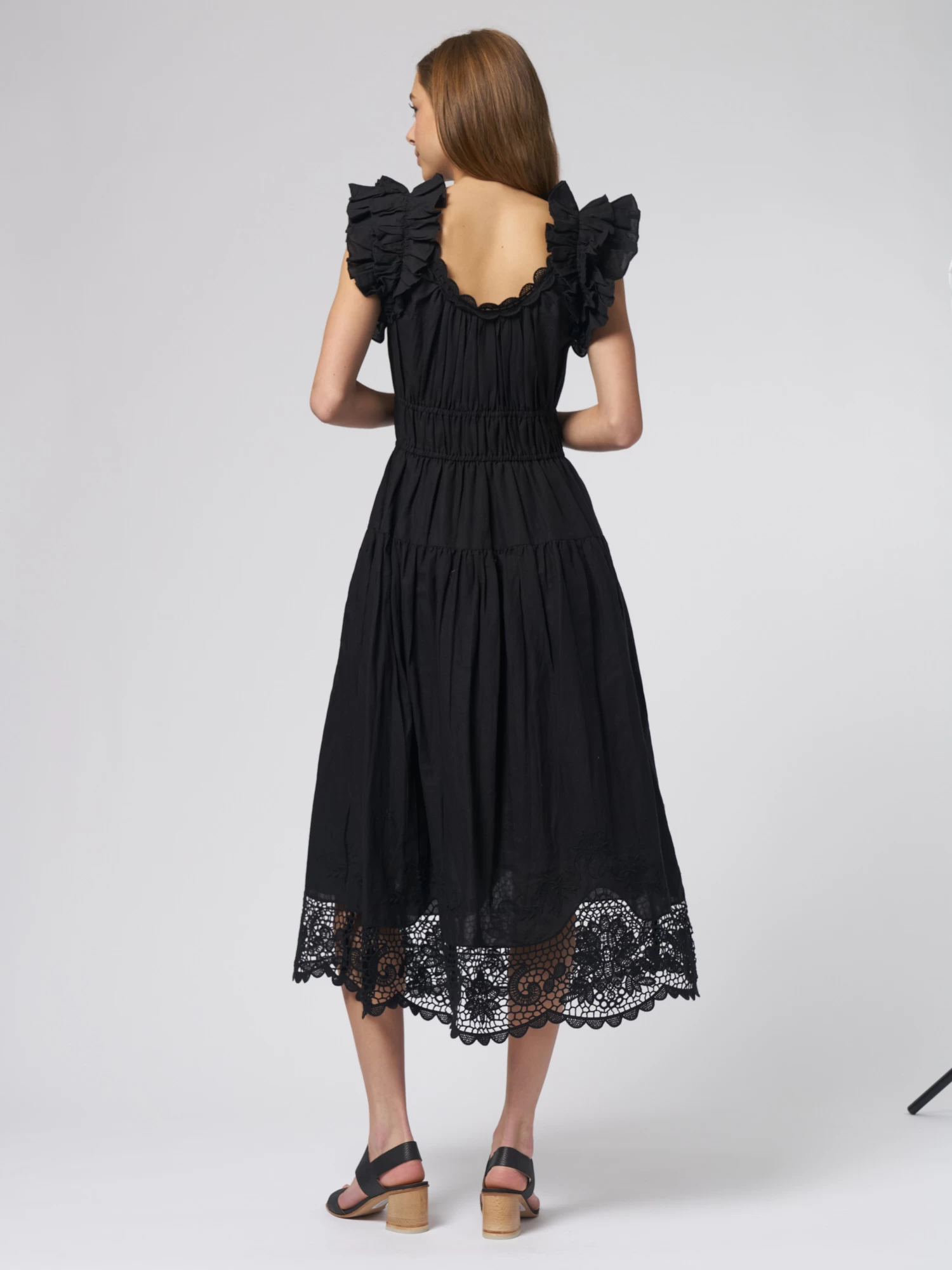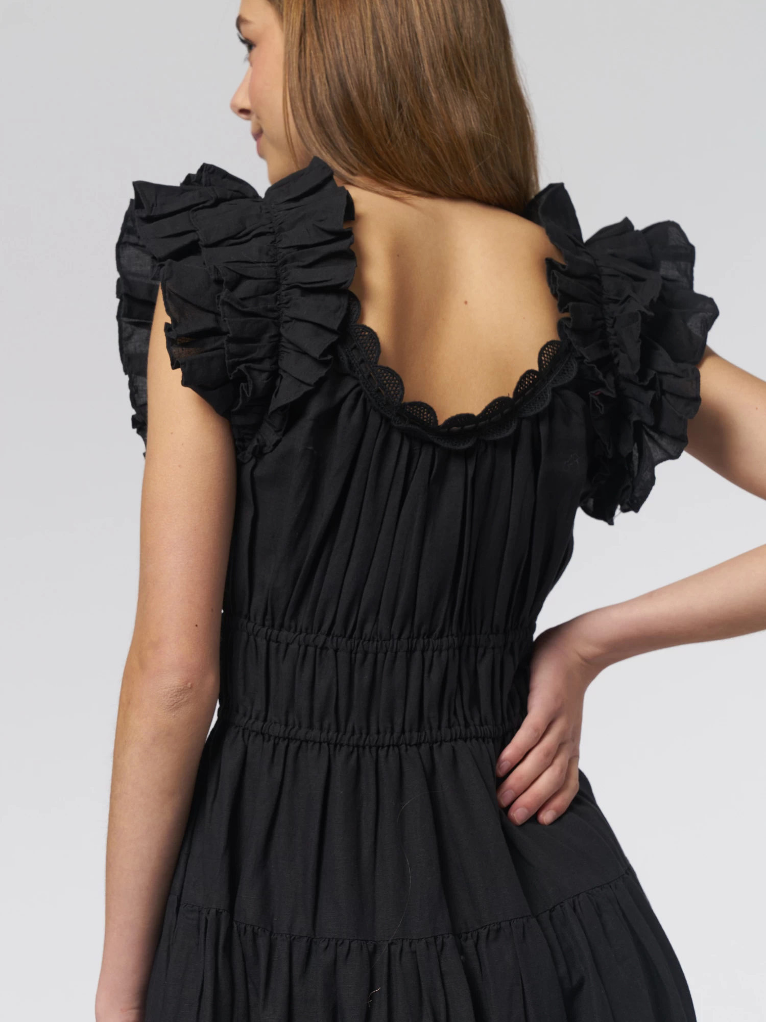 The sleeveless linen-cotton dress defined by layered, architectural ruffles along the shoulders features an elastic waist, scalloped detail along the neckline, and lacy perforations along the hemline