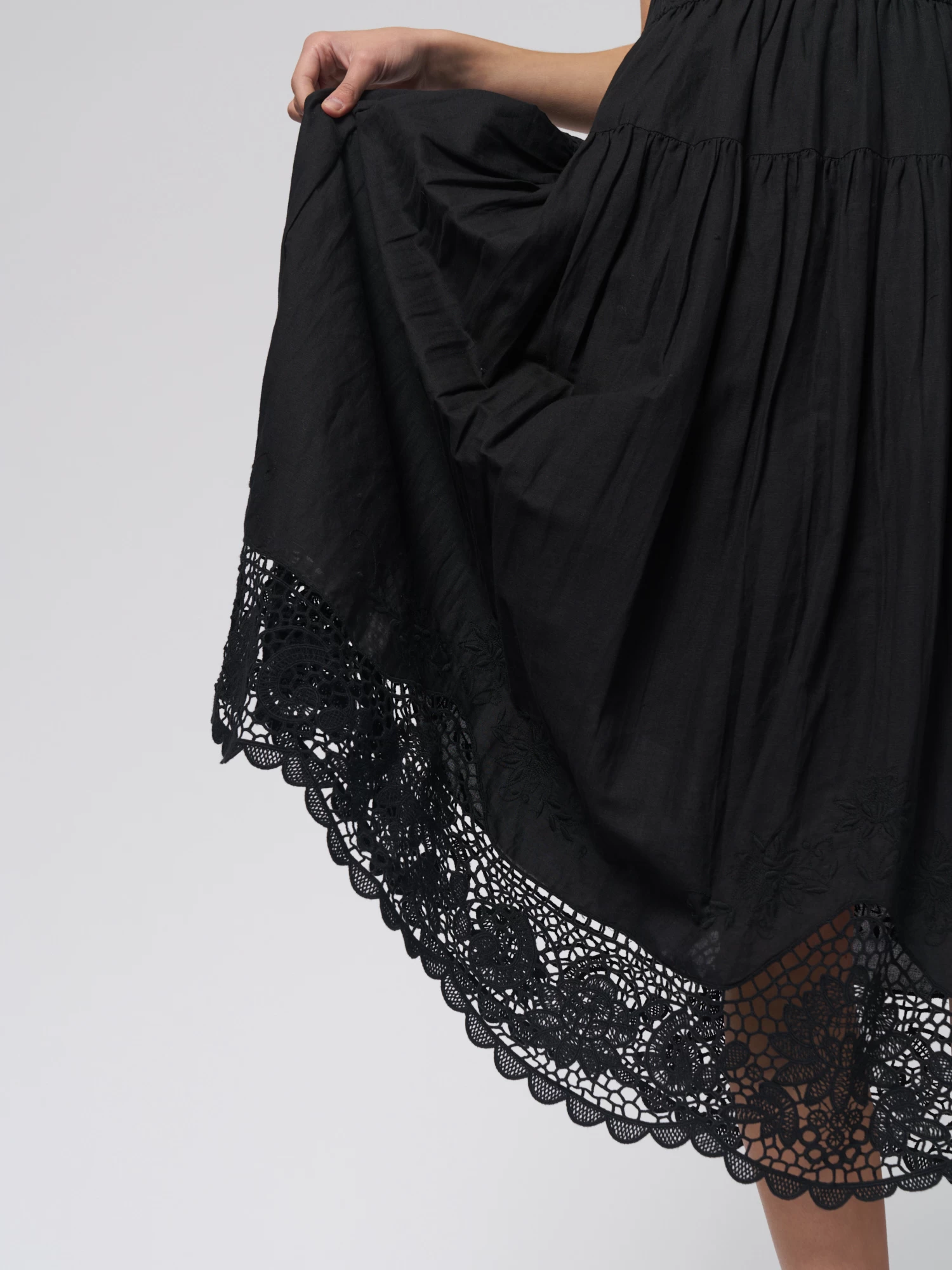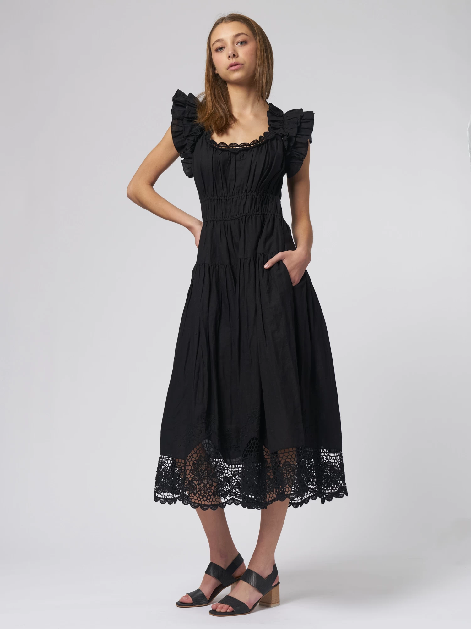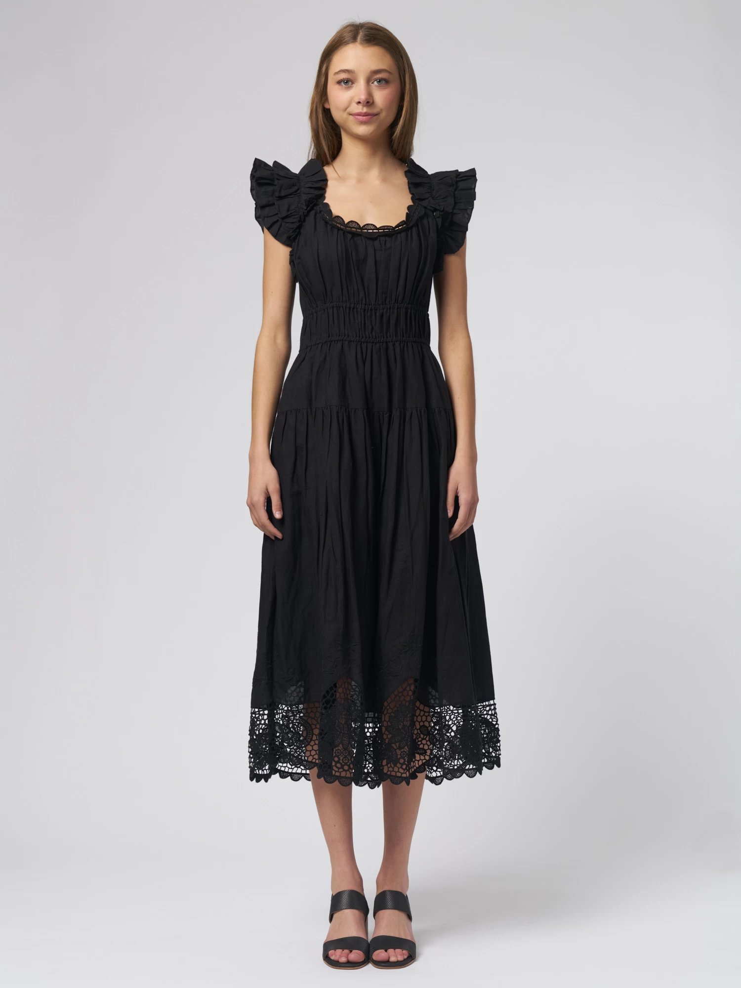 The sleeveless linen-cotton dress defined by layered, architectural ruffles along the shoulders features an elastic waist, scalloped detail along the neckline, and lacy perforations along the hemline