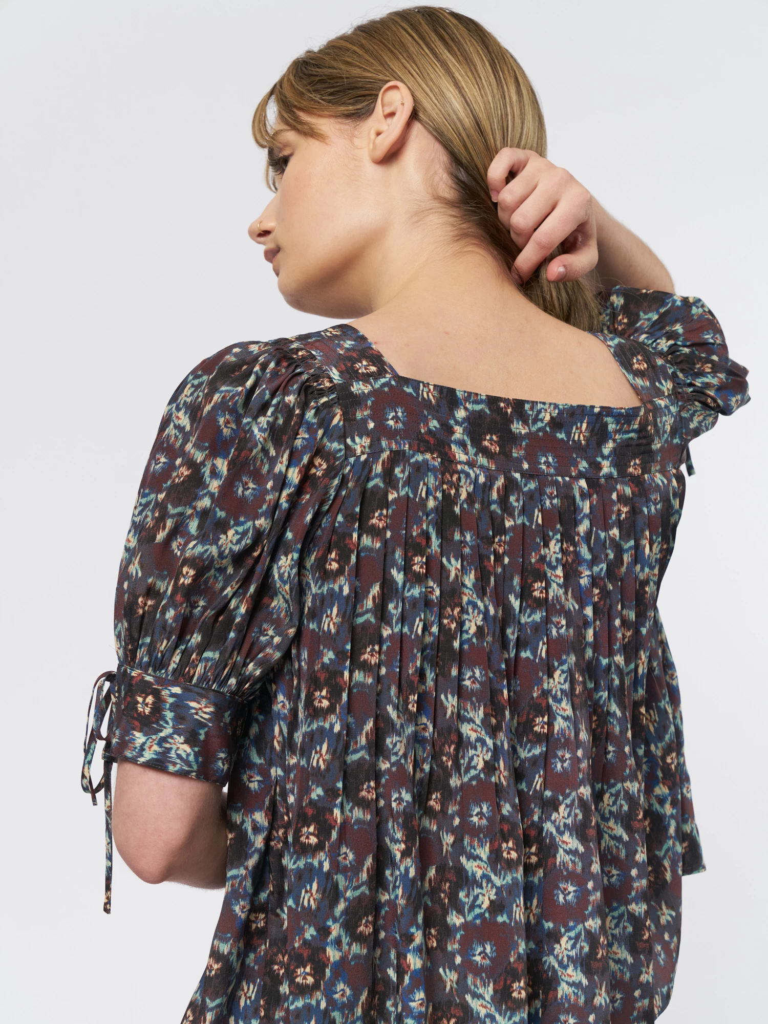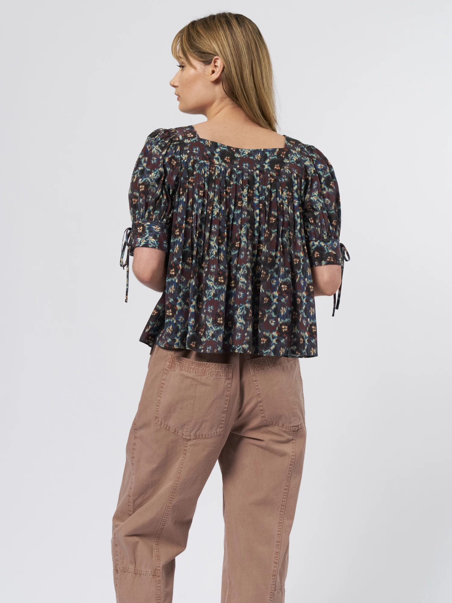 A beautiful silk crepe de chine blouse in printed spliced florals has sweet short puff sleeves with tied sleeve cuffs,