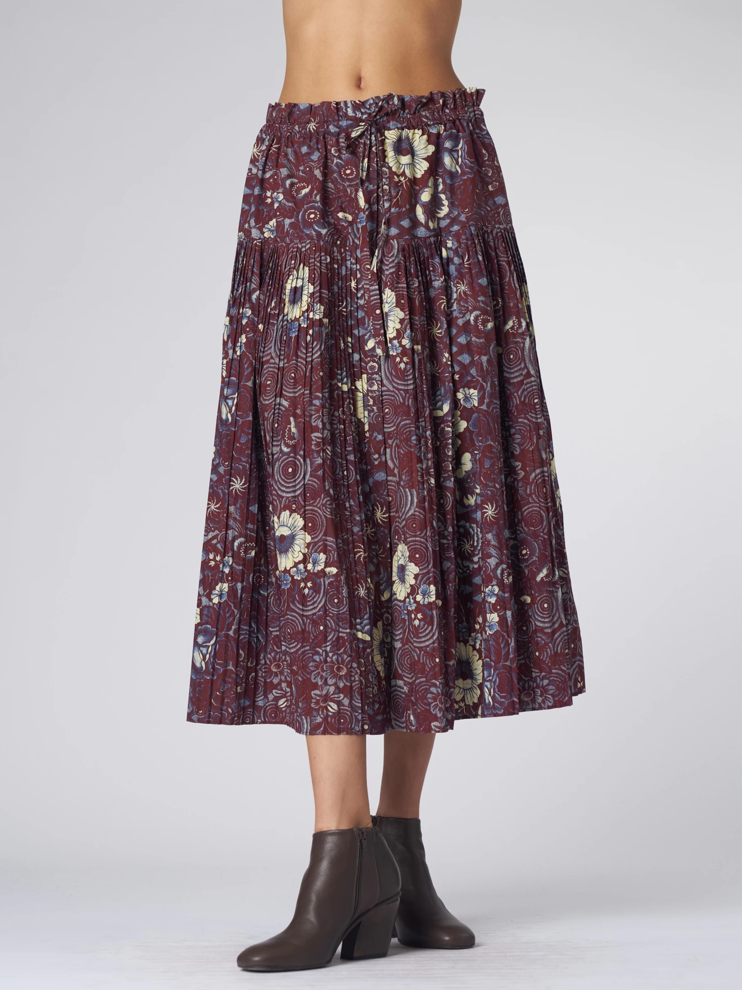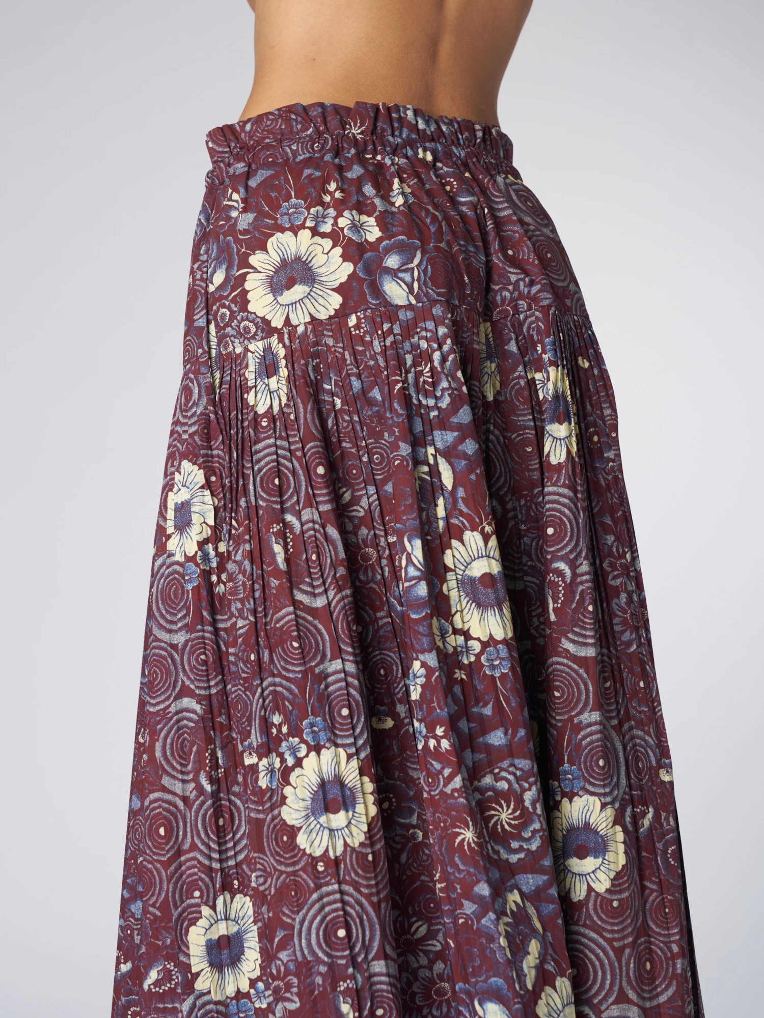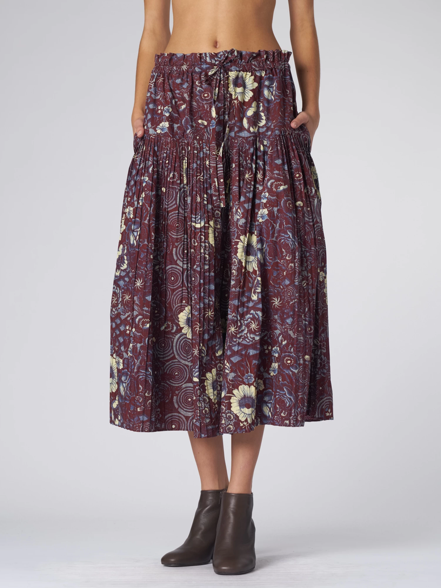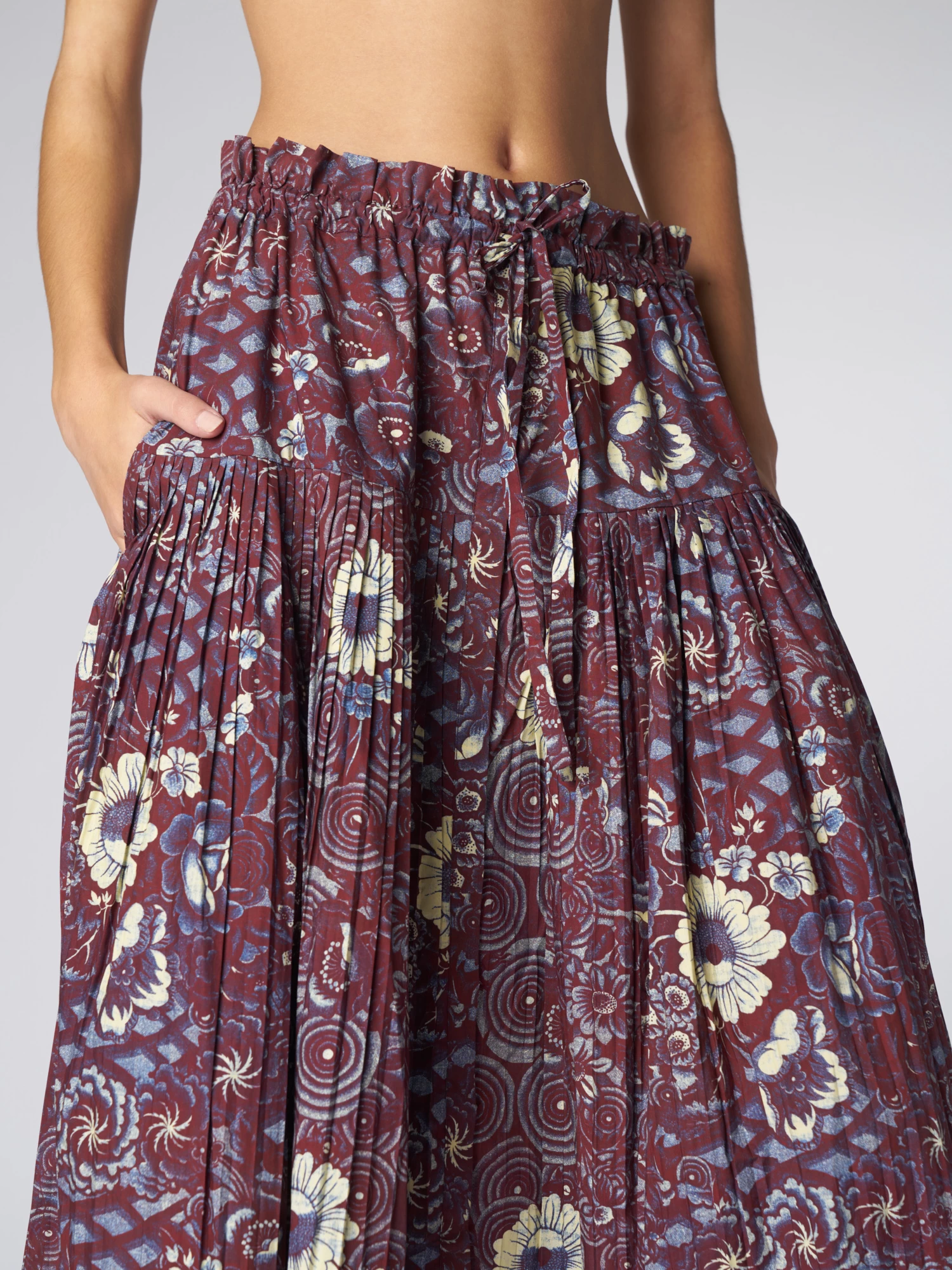 The printed cotton poplin midi-length skirt features micro-pleats along the hip, hidden pockets, an elastic waistline, and a tonal grosgrain tie.