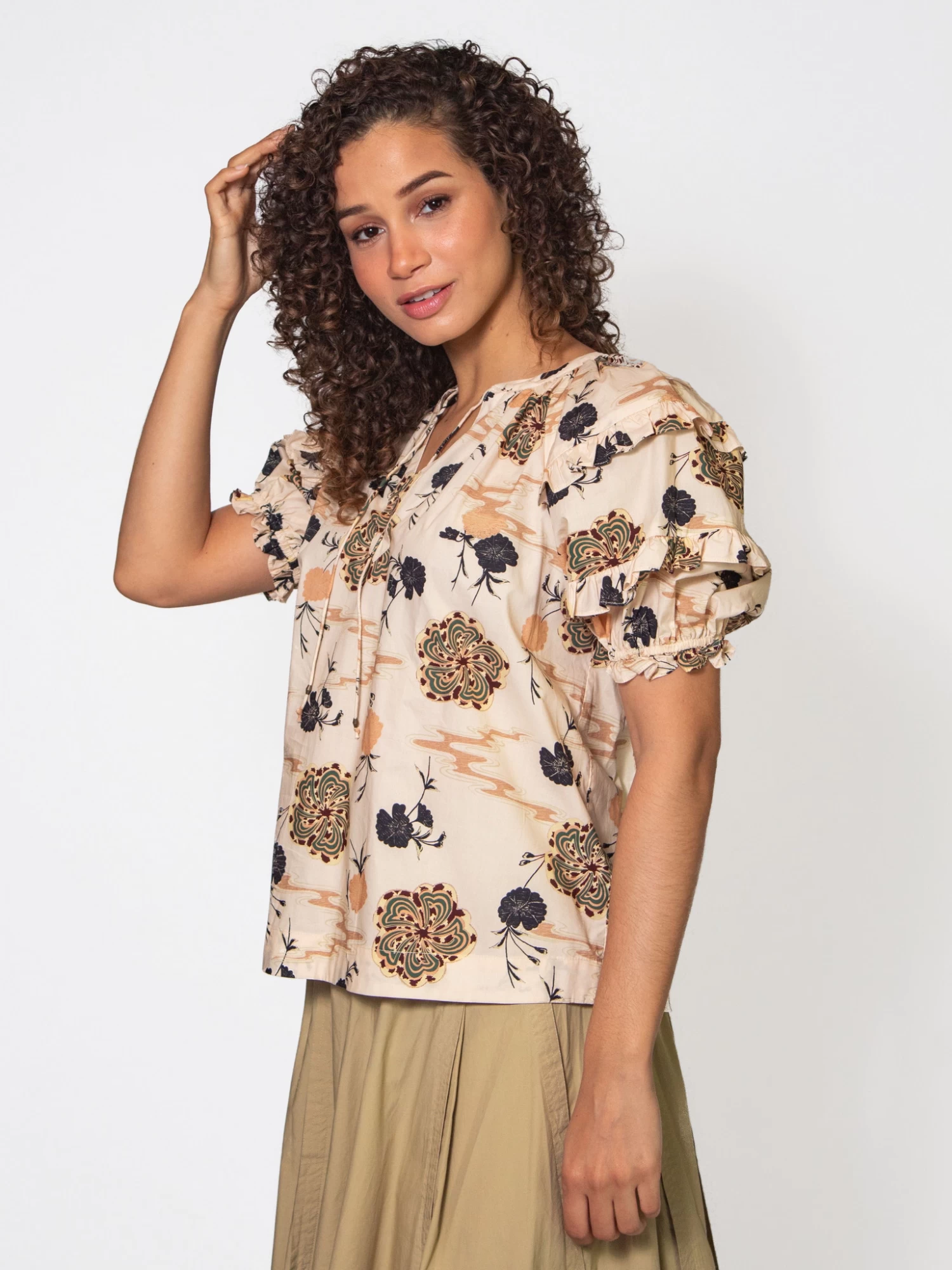 This puff sleeve blouse is perfect for the warmer summer months, and is enhanced with delicate ruffles along the sleeves, framing a loose-fitting silhouette.