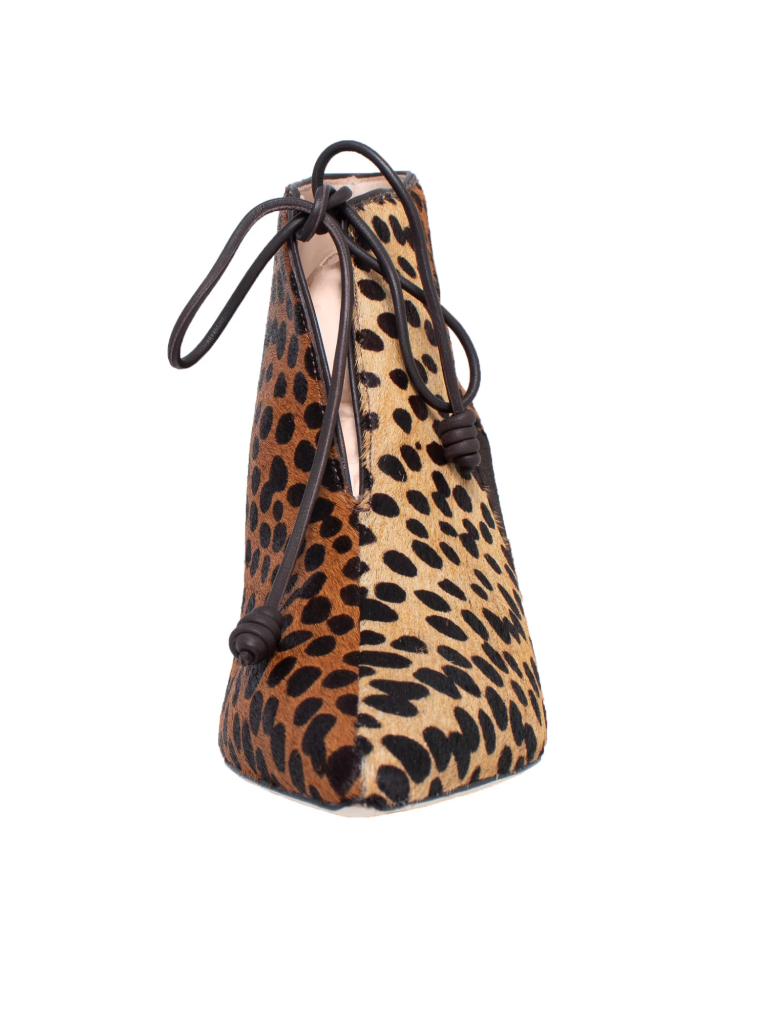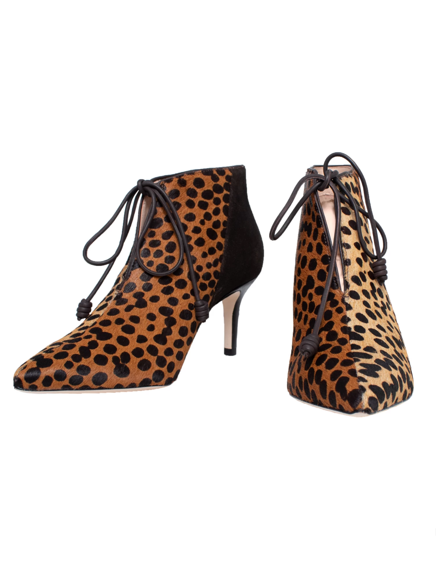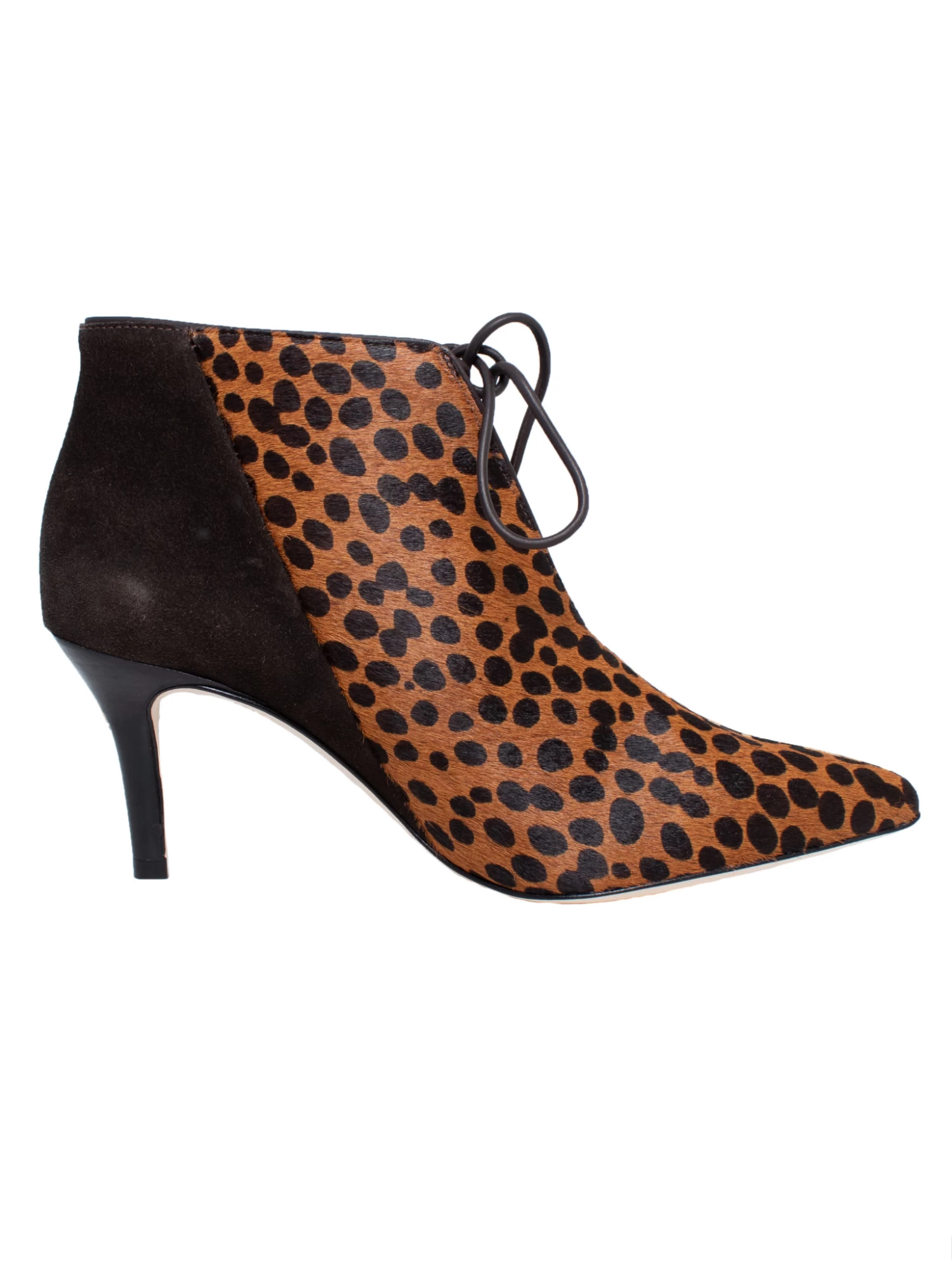 A high heel, ankle bootie features a tie at ankle, pointed toe, and stiletto heel in a patchwork of leopard calf hair and dark brown leather.