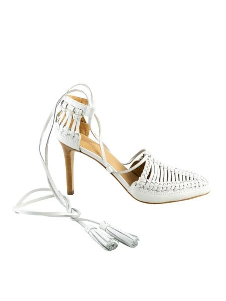 A handmade, leather, caged heel with braided details and ankle ties with tassels.