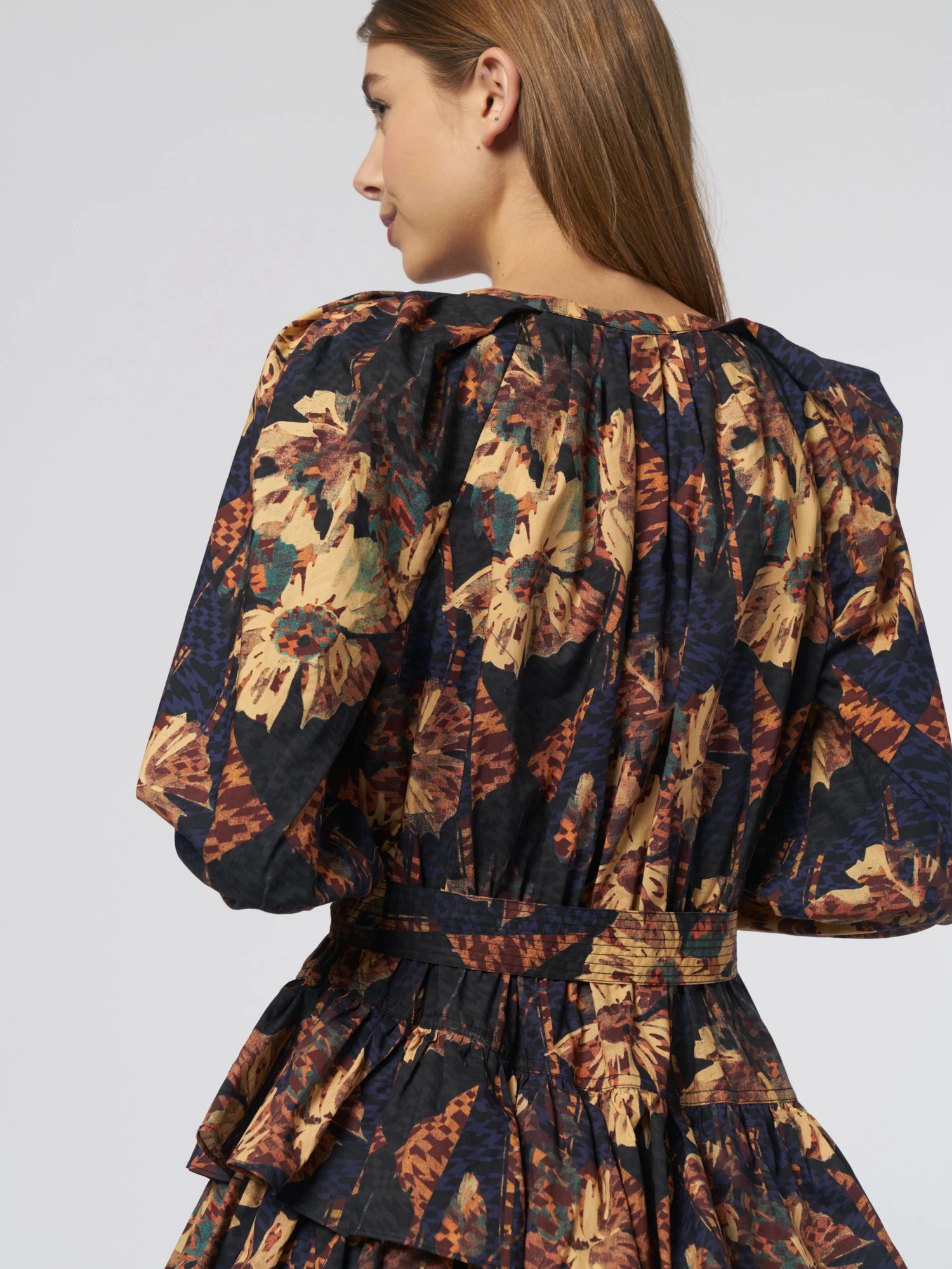 The V-neck cotton poplin dress features a ruffled skirt, billowing sleeves, and a comfortable elastic waistband.