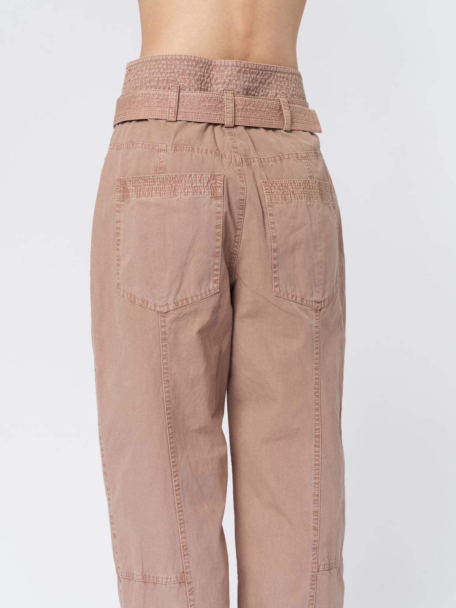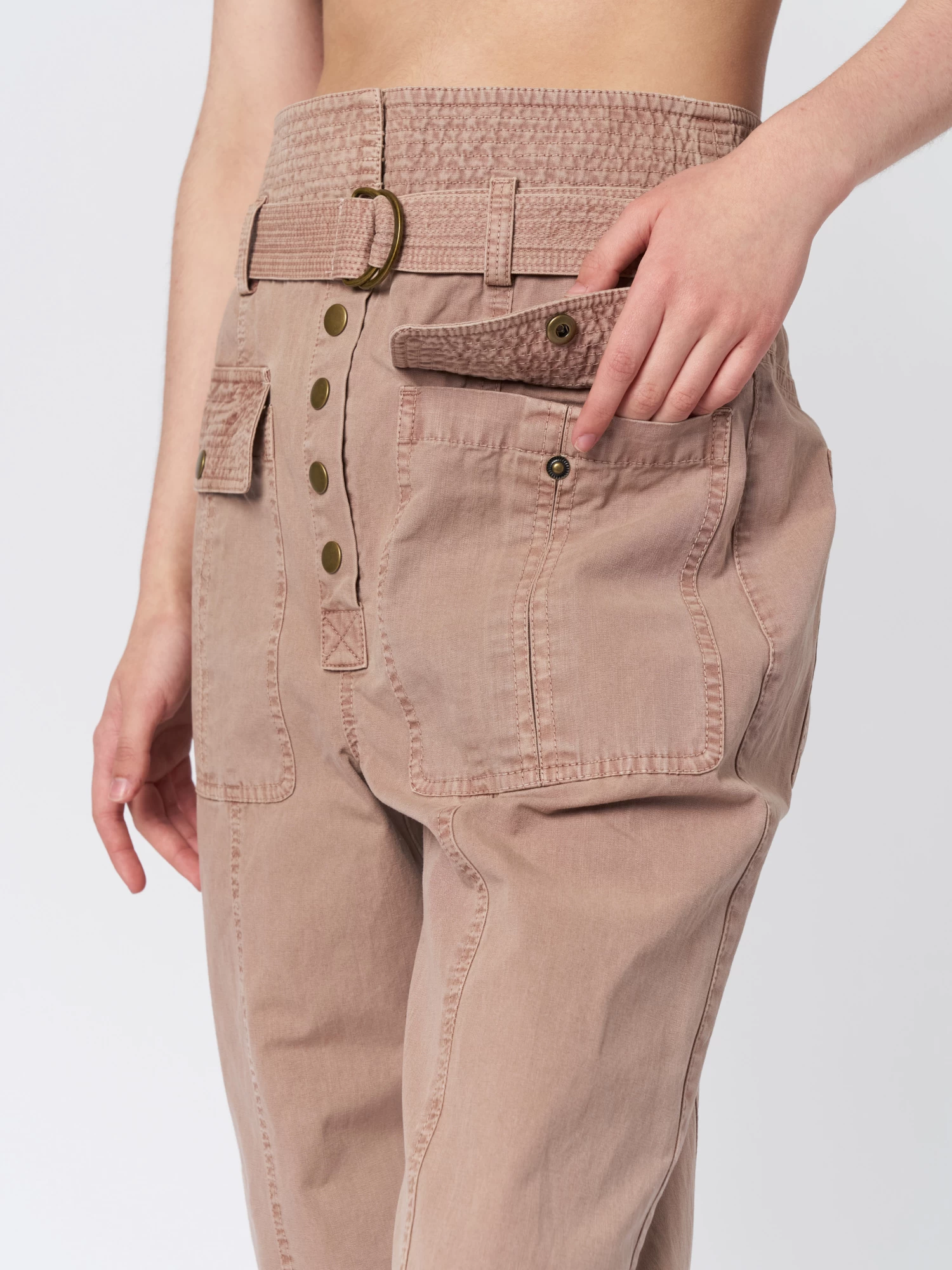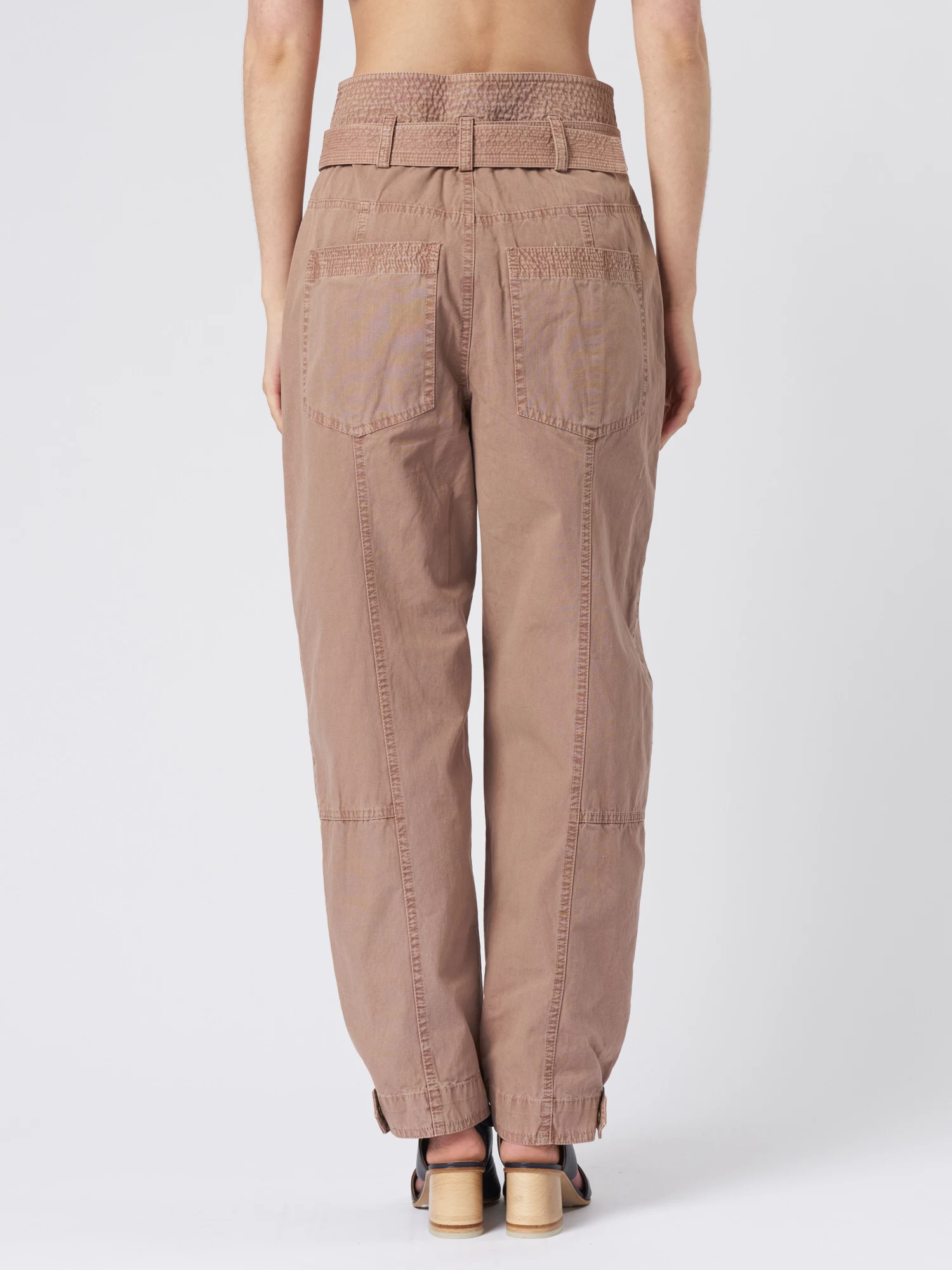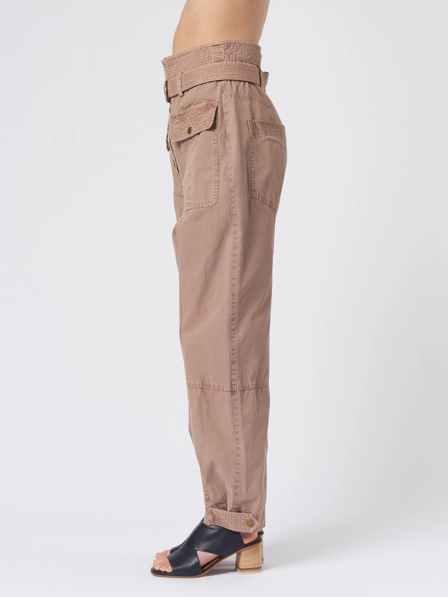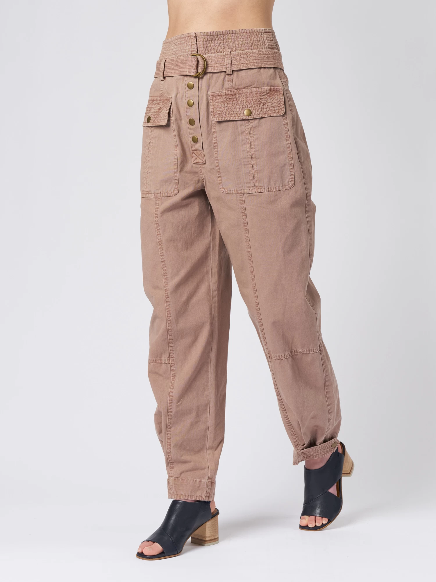 Utilitarian-style in garment-washed cotton pants have straight legs with cuffed hems, a high waist with topstitched belt loops, and pleated patch pockets.