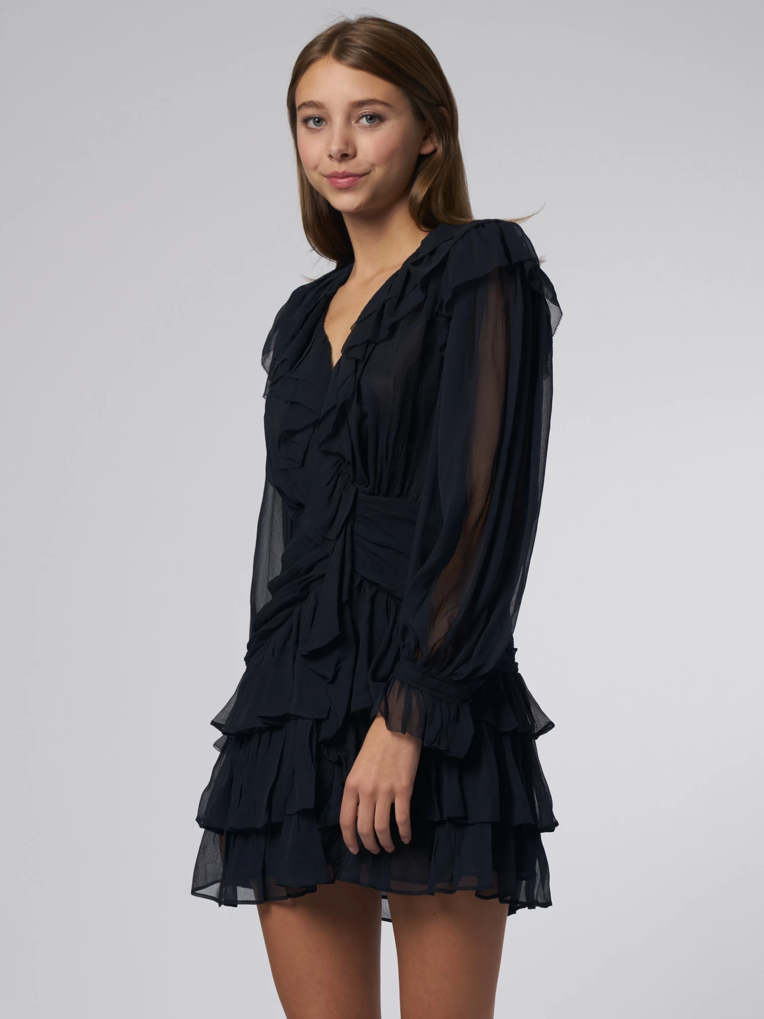 The ultra-feminine silk dress features cascading ruffles along the neckline, a sarong-style waist, and a tiered skirt with layers of gathered frills.