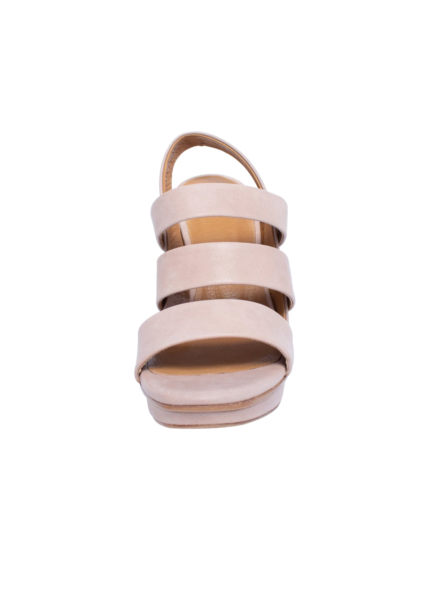 A three-strap slingback platform sandal with a solid wood sculpted heel in a neutral bone colored leather.