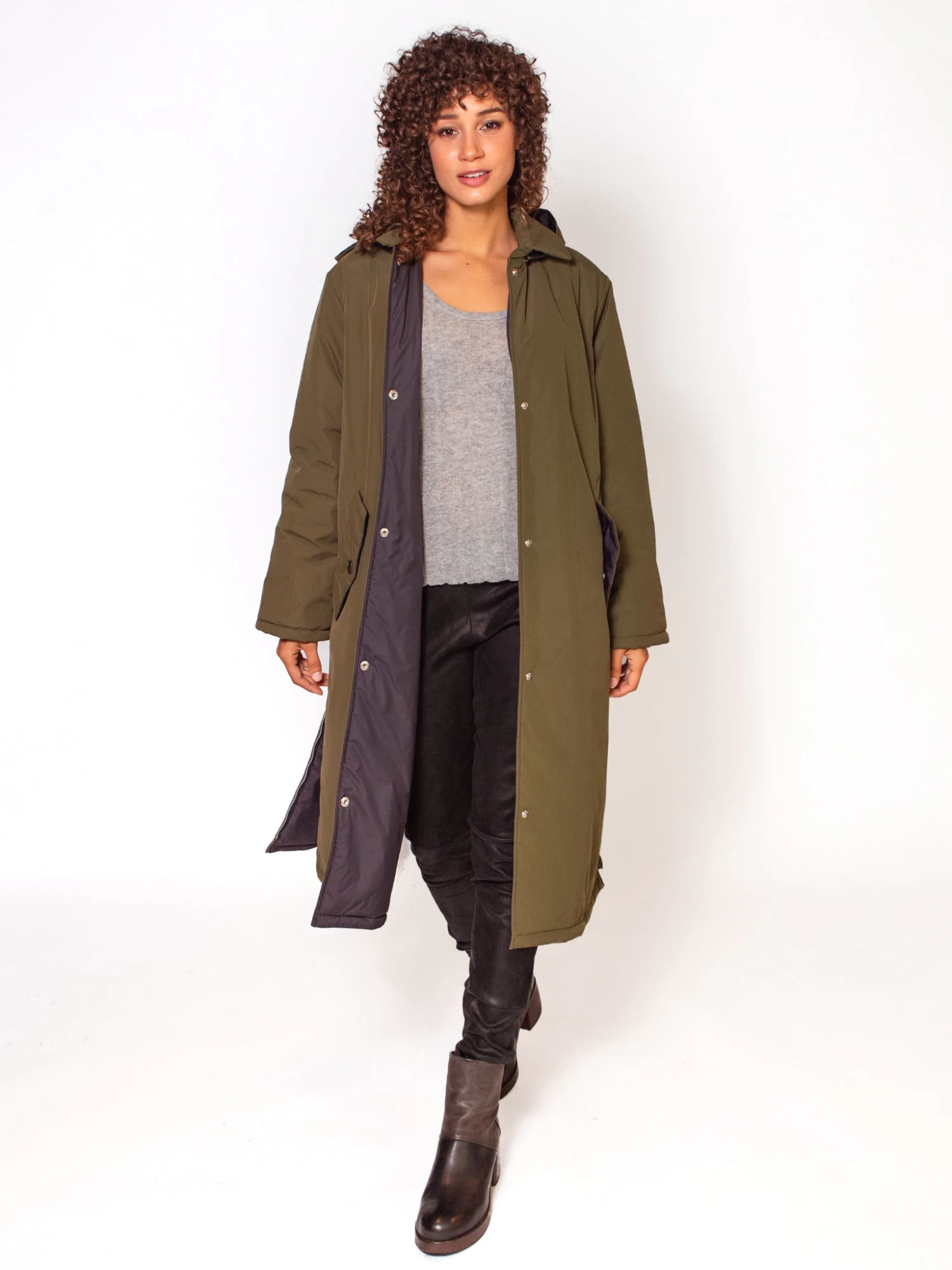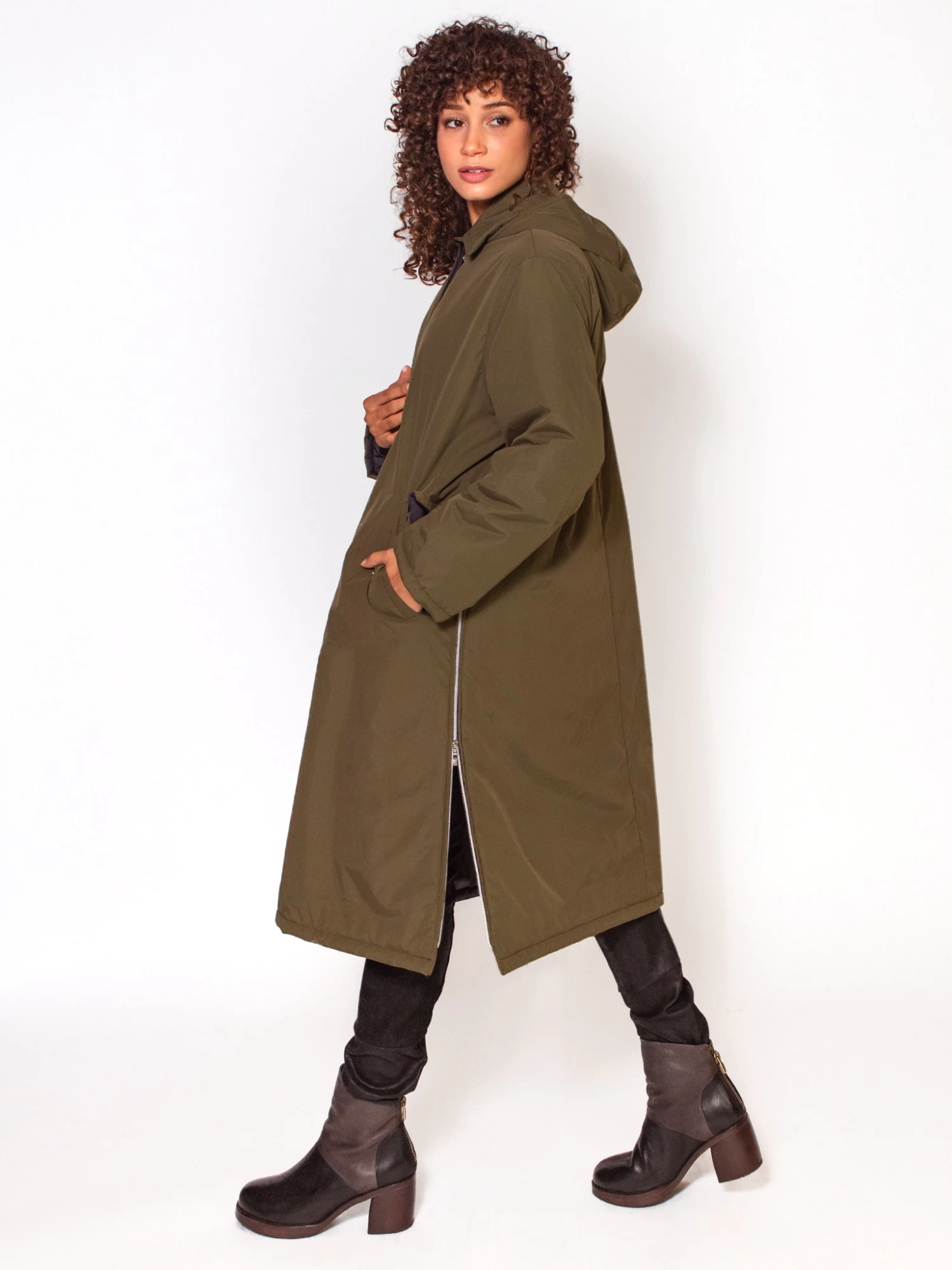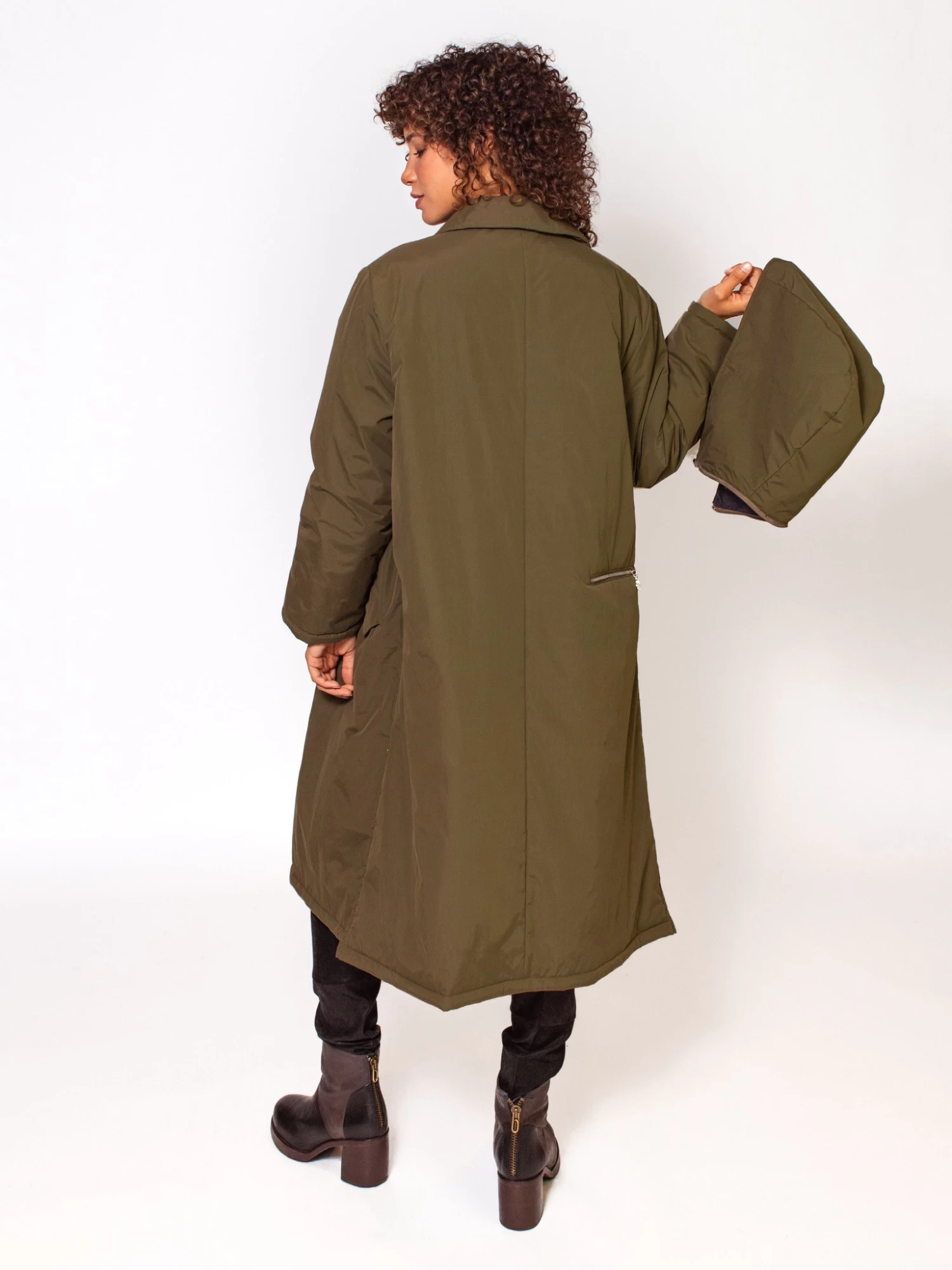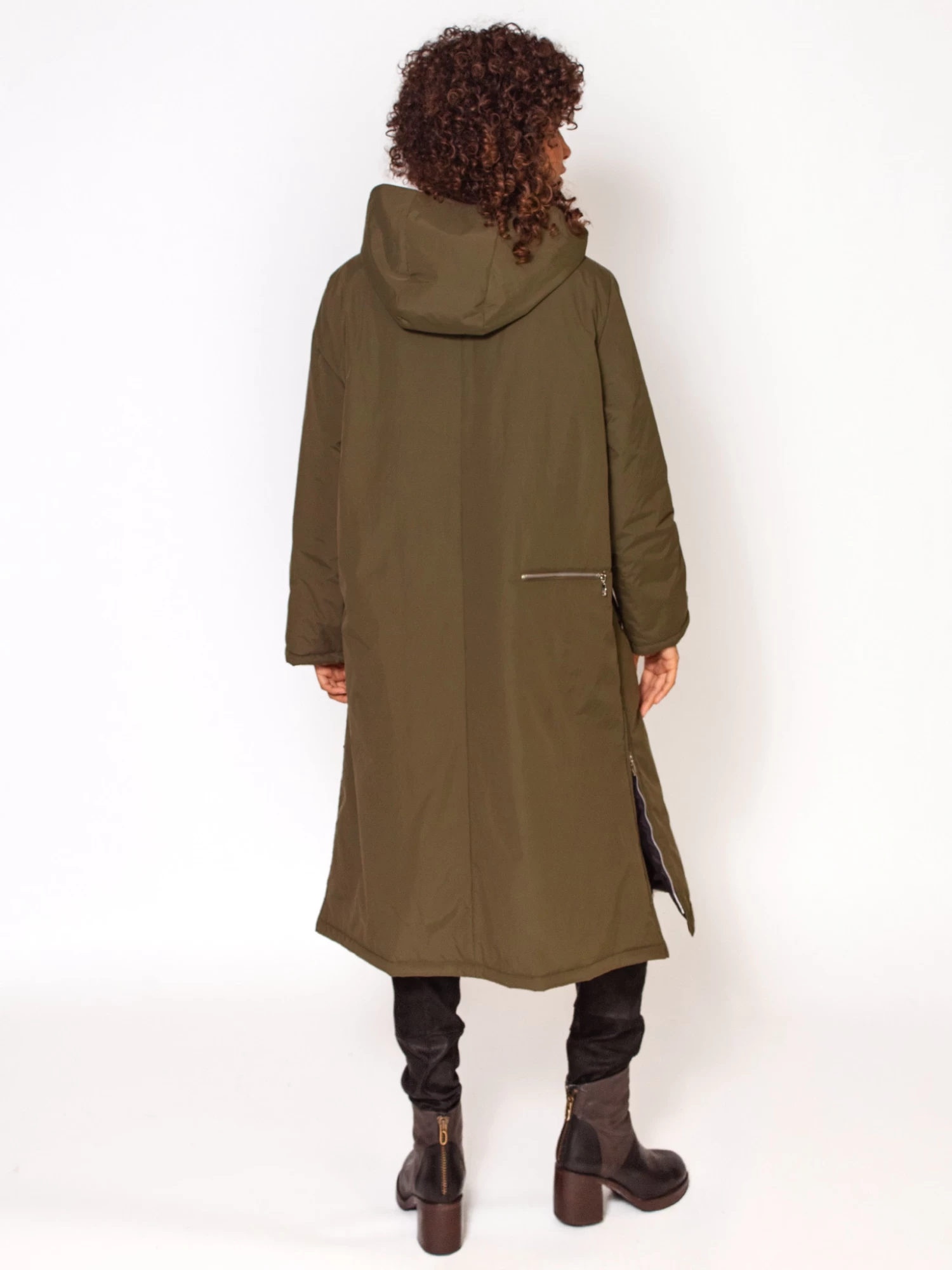 A puffy, long coat with button closure, two front pockets, and a back zip pocket. Includes a zip slit on each side.