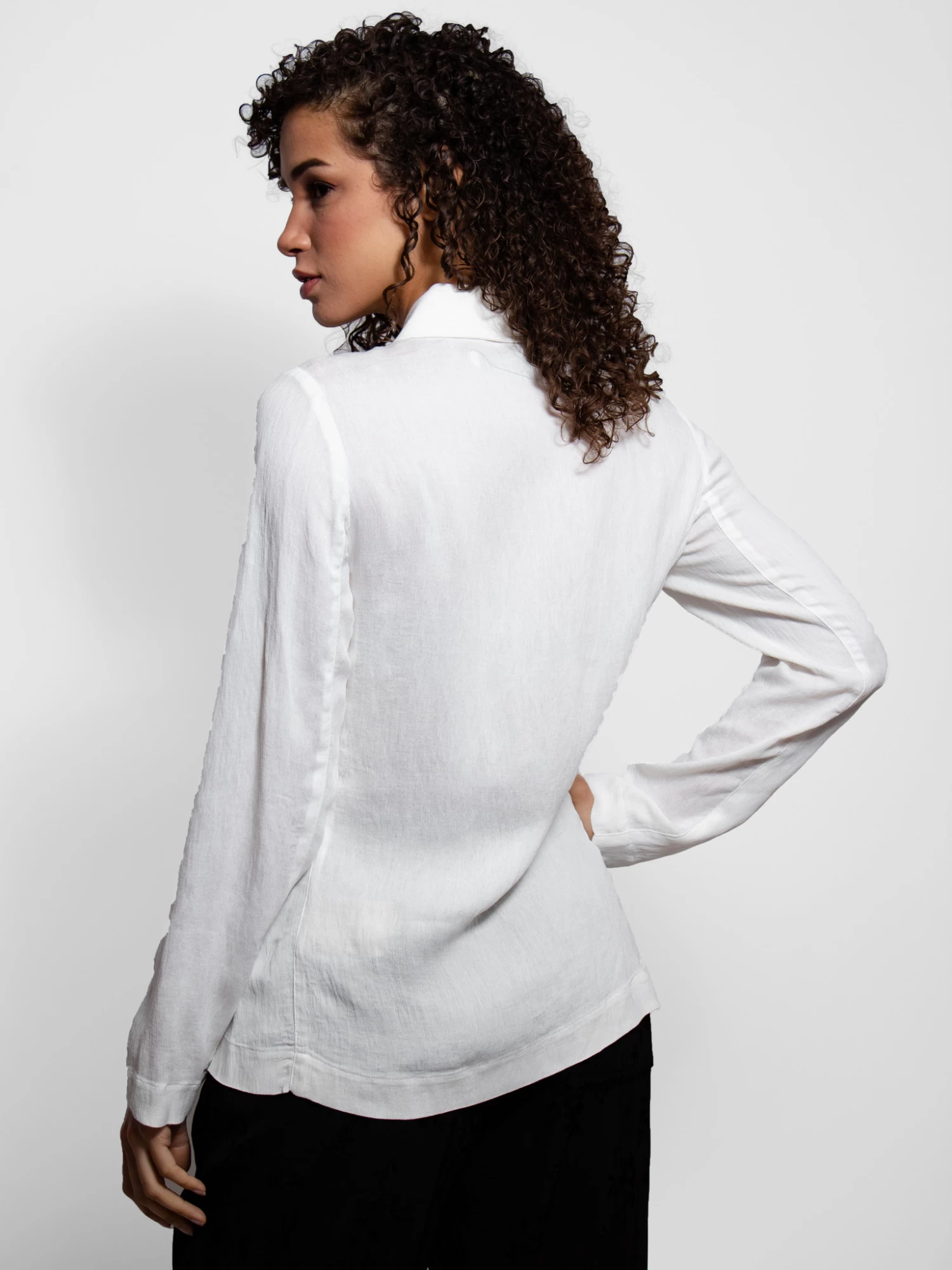 Washed white blazer in pleated rayon. Slightly relaxed fit, four button closure.