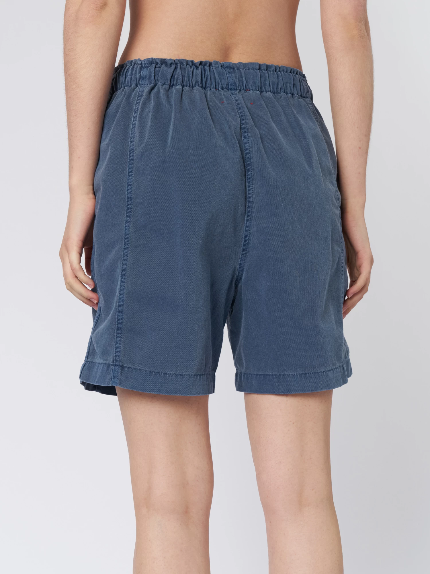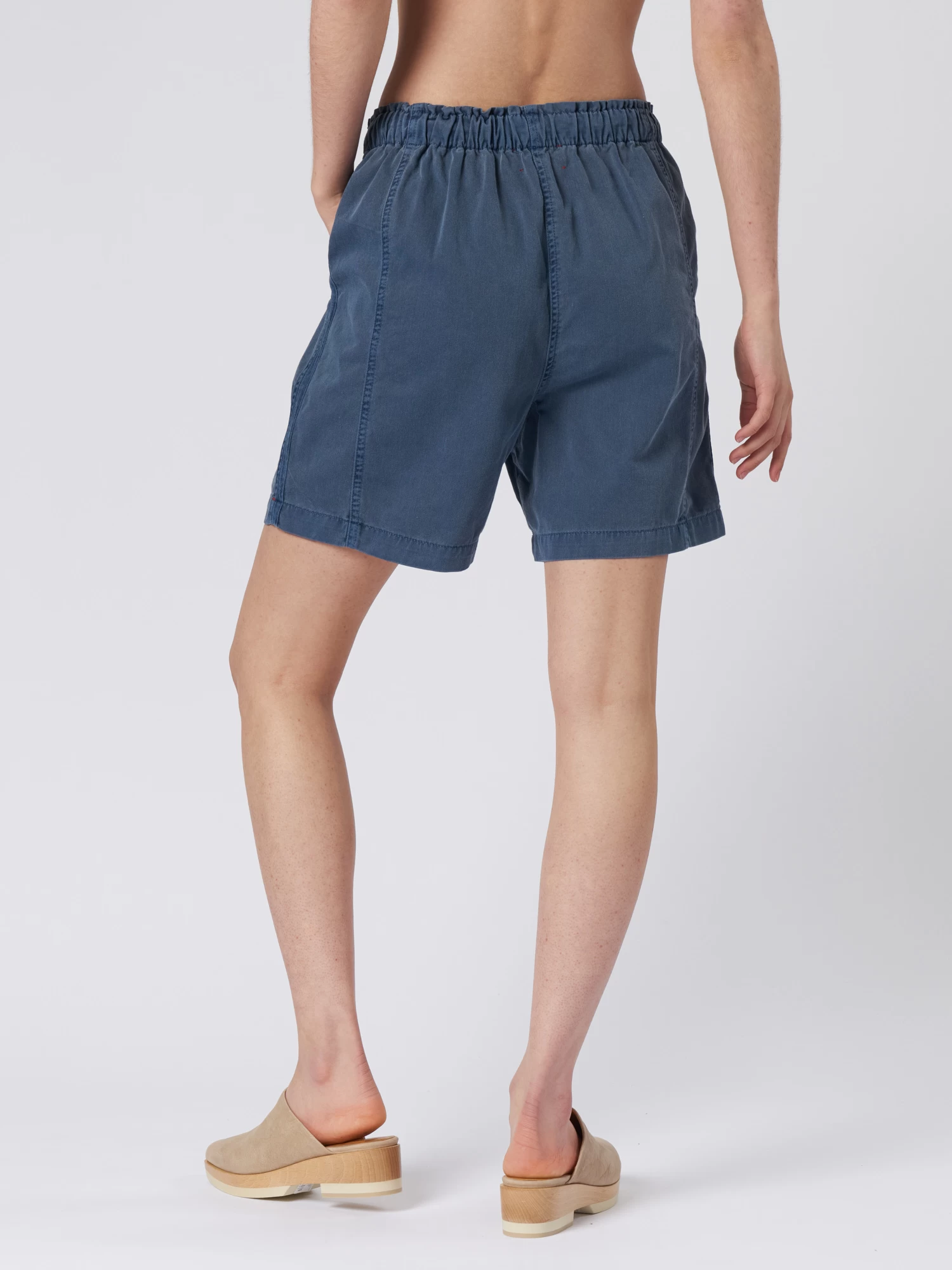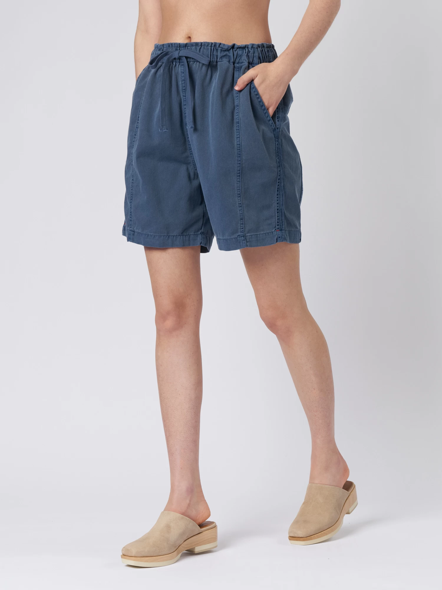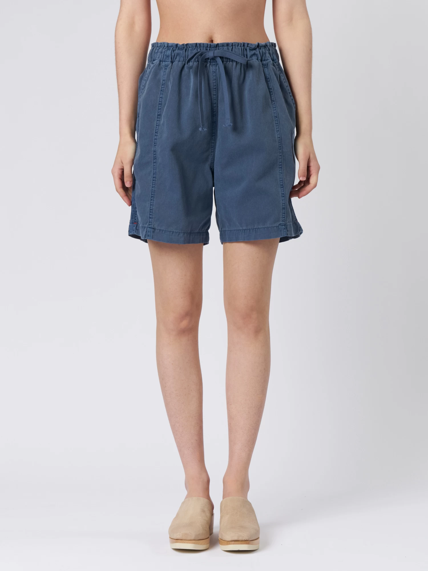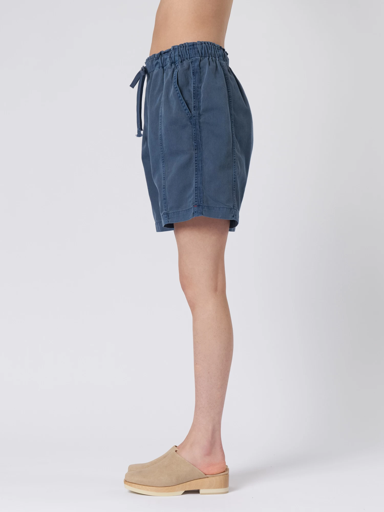 Cotton twill easy short has a paper bag waist, elasticized drawstring, and two side seam pockets.