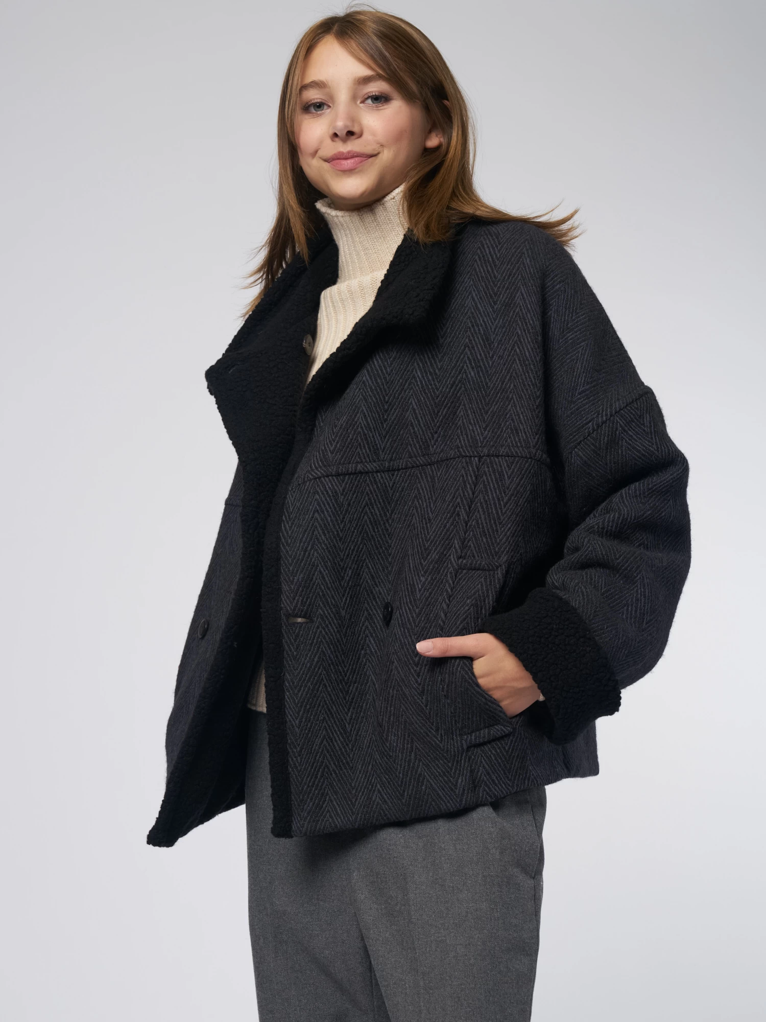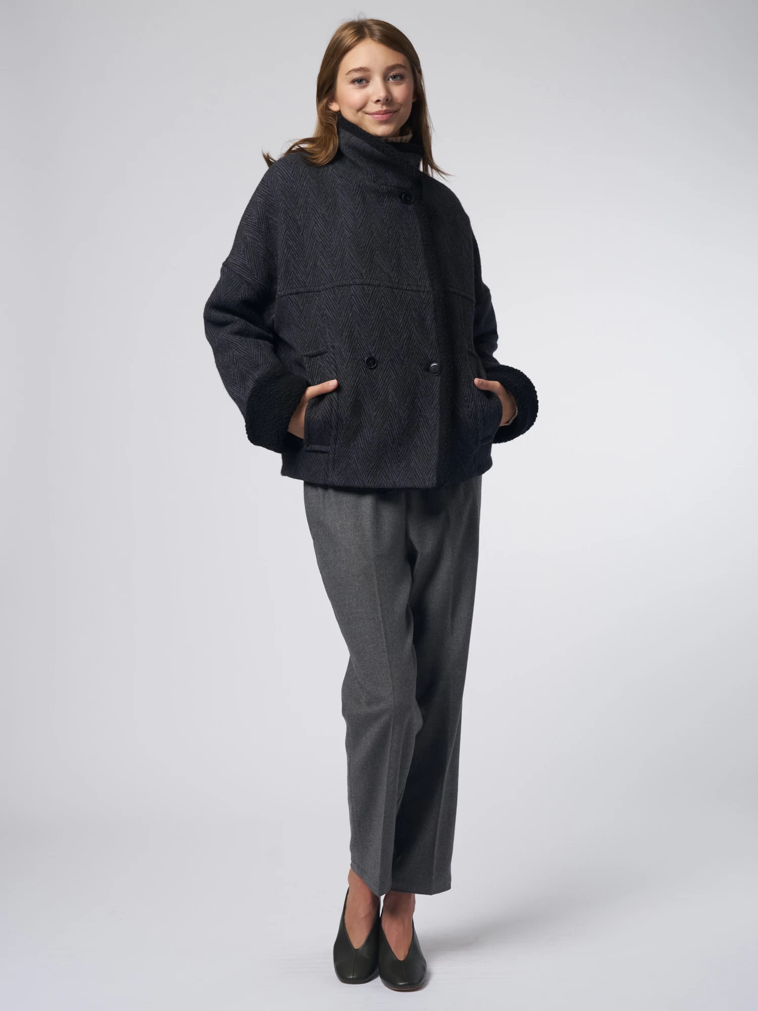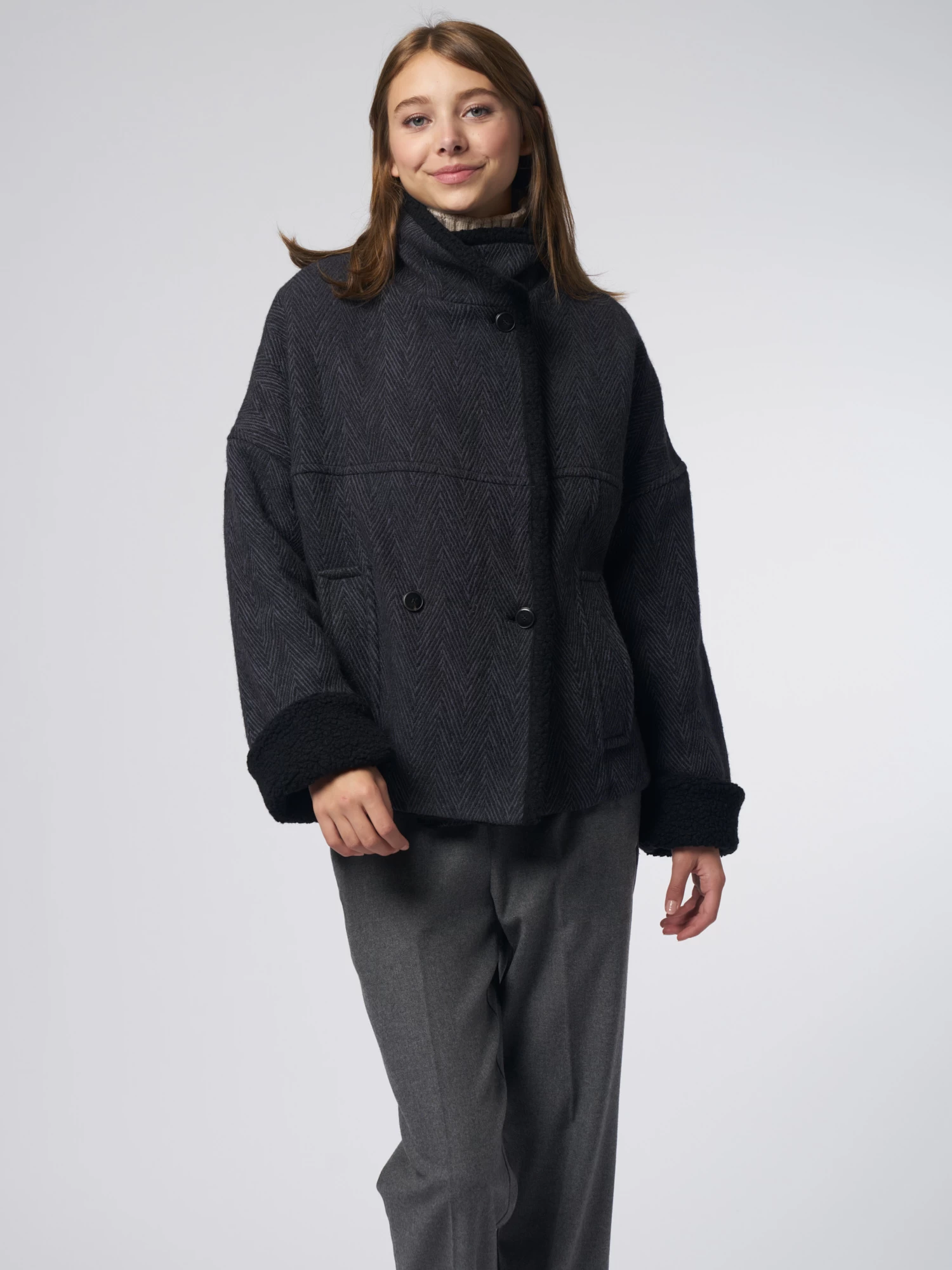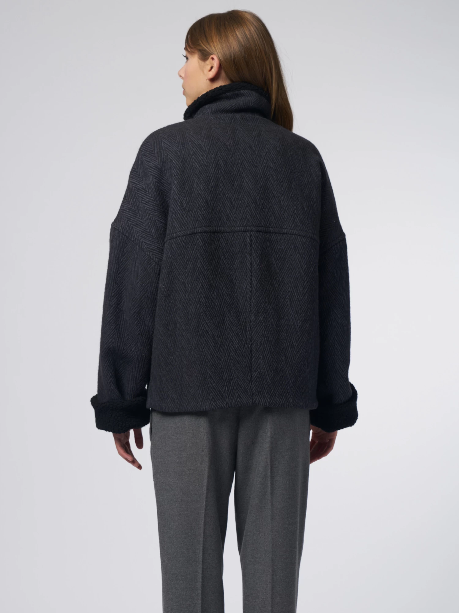 Herringbone pattern reversible jacket in wool and cotton with bouclé fabric inside features a high collar, front cuts, side pockets, and double-breasted closure with visible buttons.