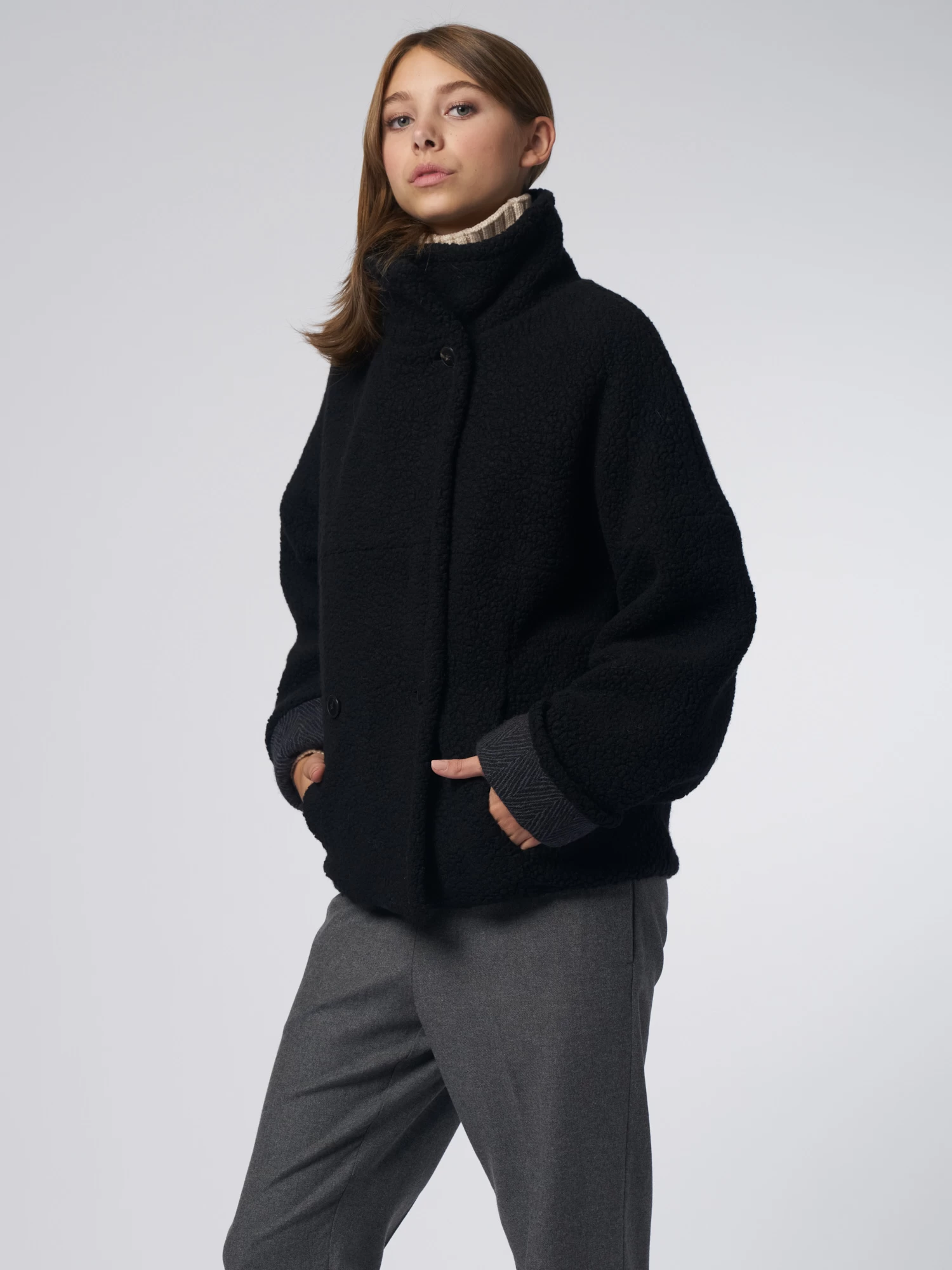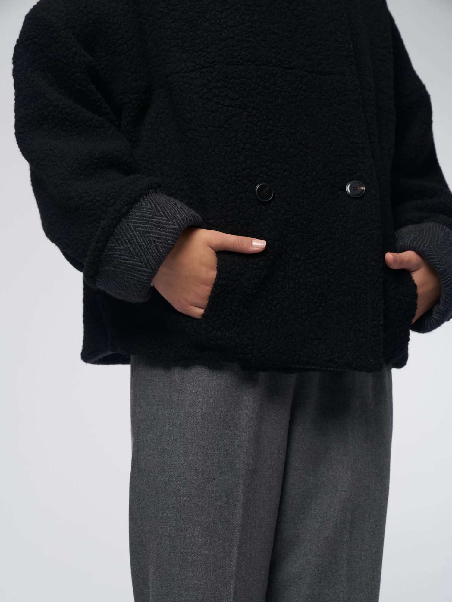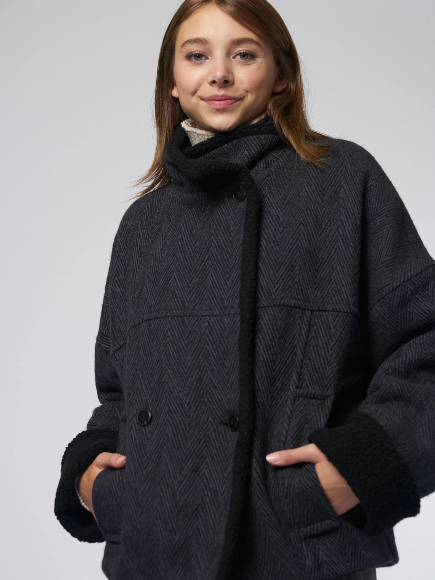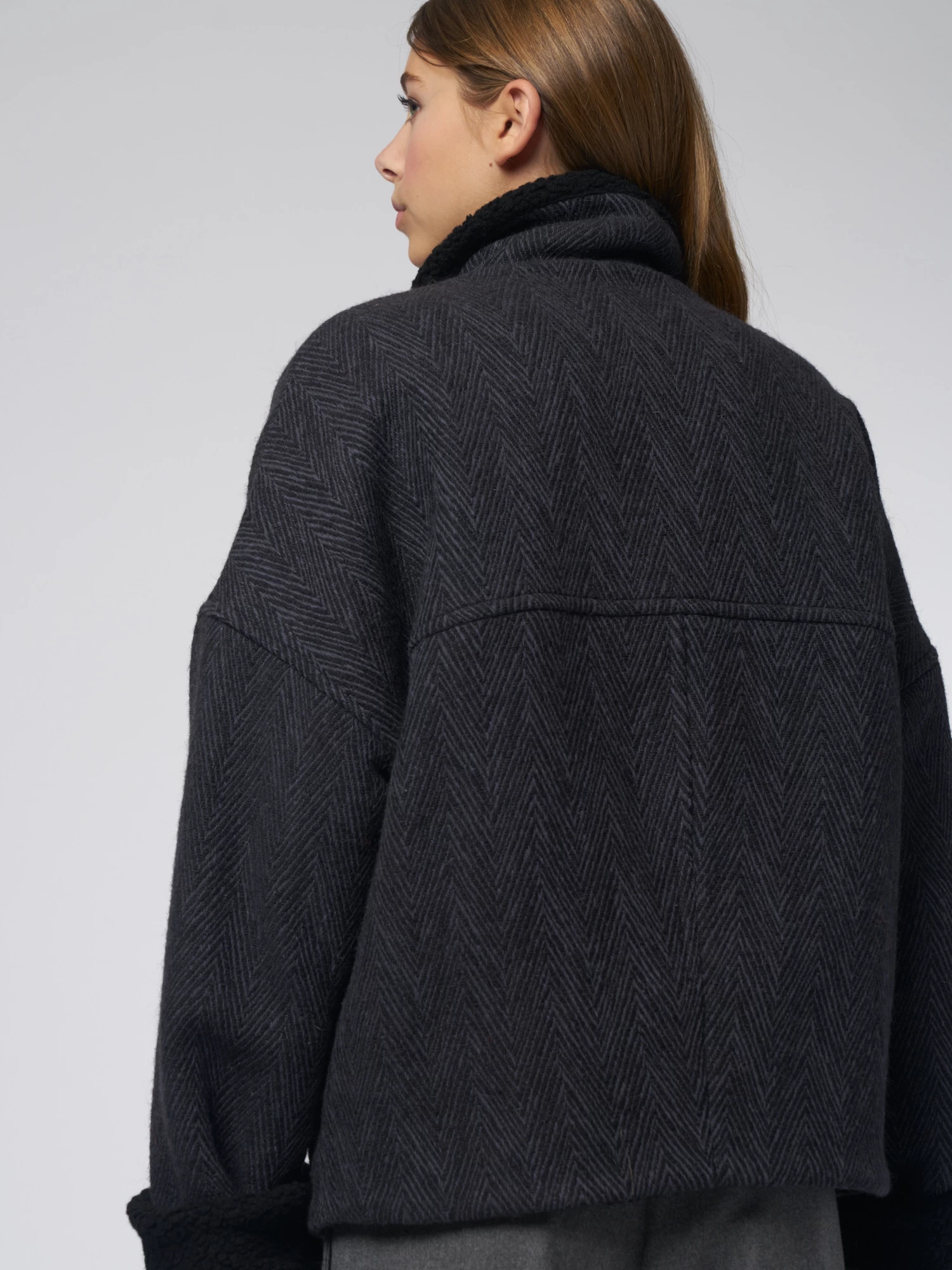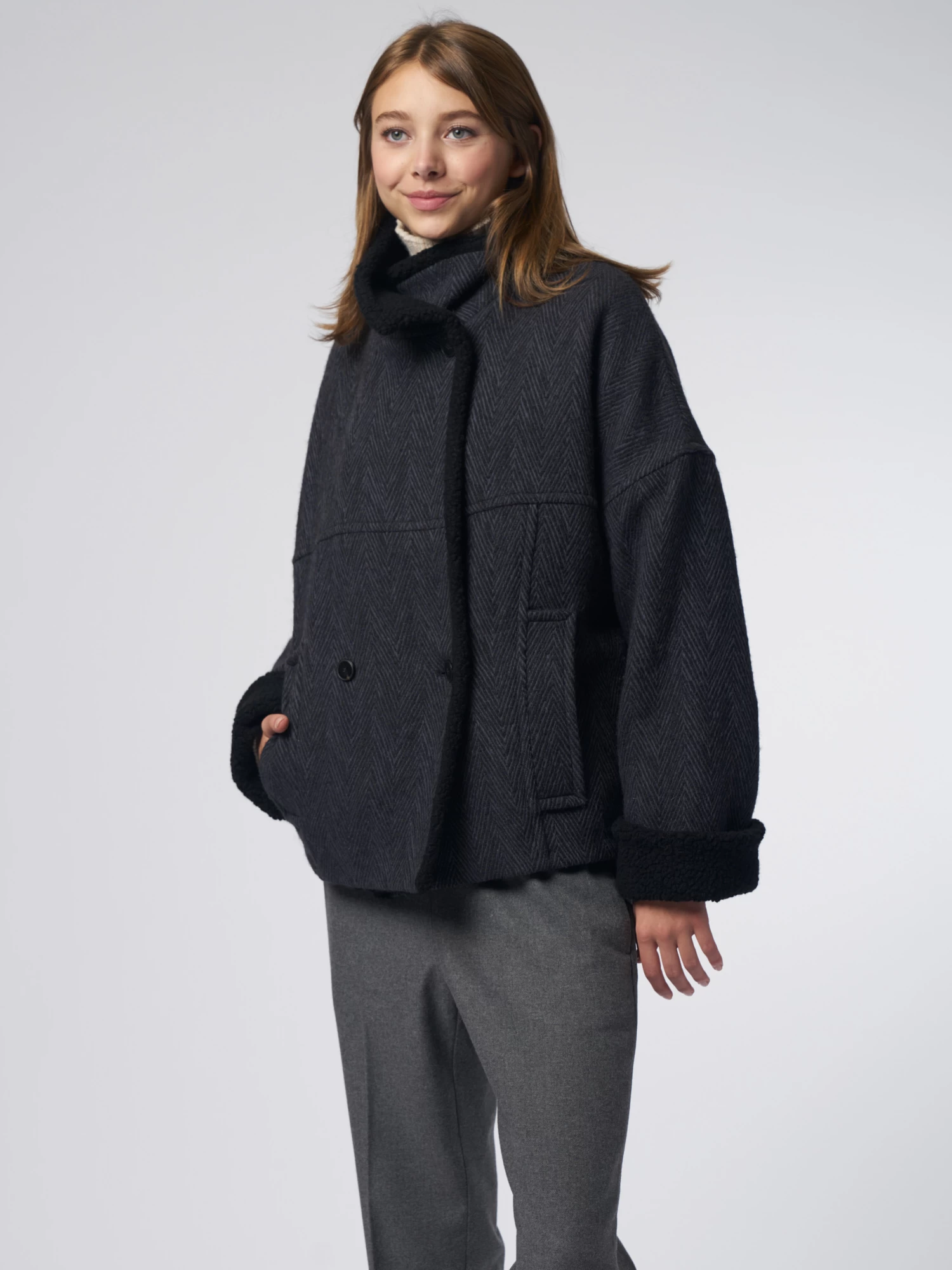 Herringbone pattern reversible jacket in wool and cotton with bouclé fabric inside features a high collar, front cuts, side pockets, and double-breasted closure with visible buttons.